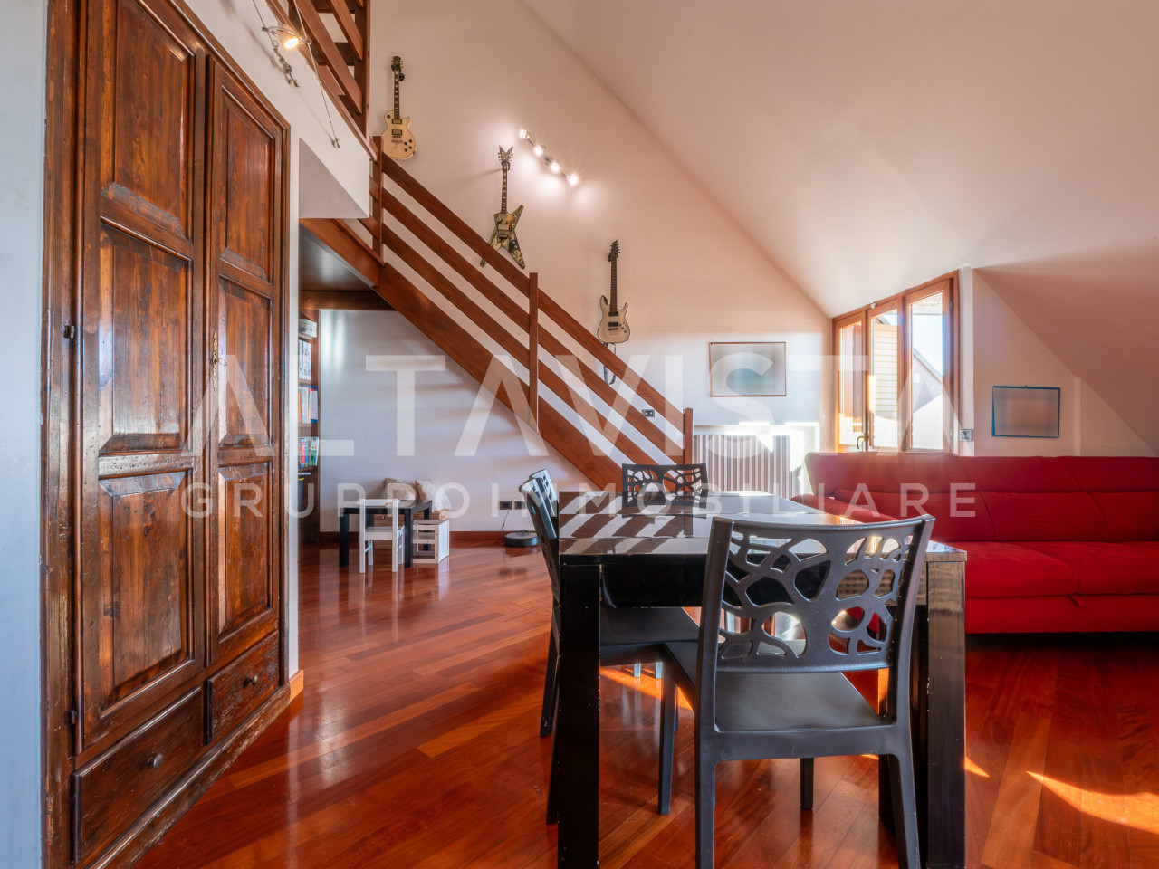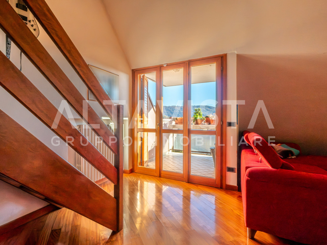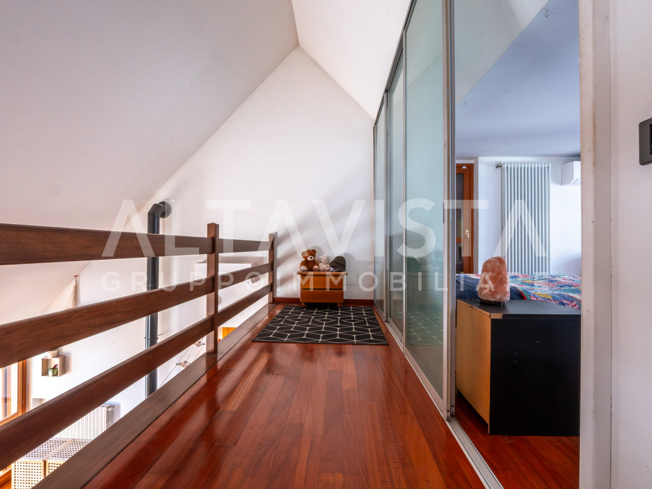 Dal soggiorno, una raffinata scala in legno porta al piano superiore, dove un suggestivo ballatoio affacciato sulla zona giorno crea un effetto scenografico di grande charme. Qui si trova la suite padronale, con terza camera dalle dimensioni generose e secondo bagno finestrato, perfetta per garantire privacy.
