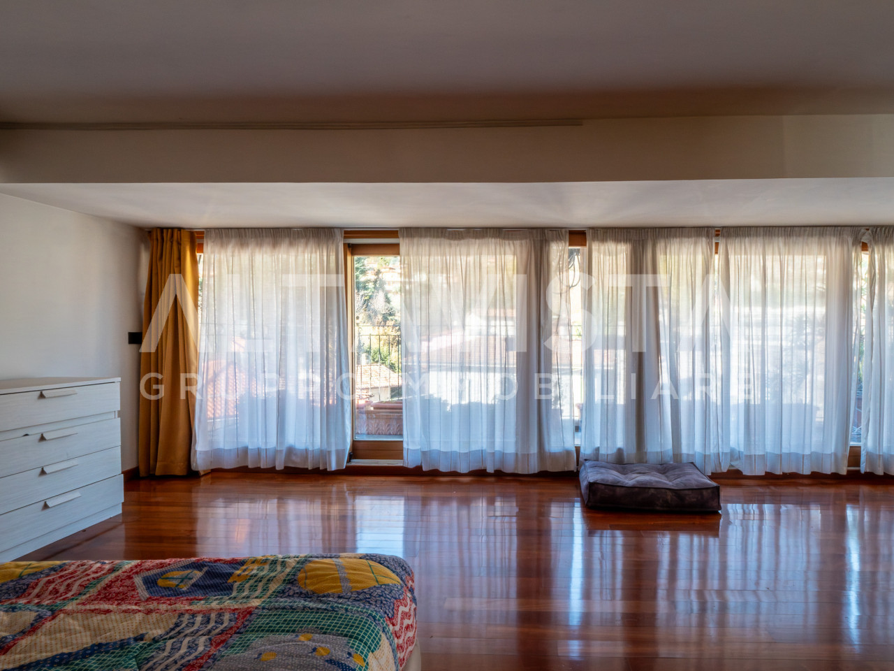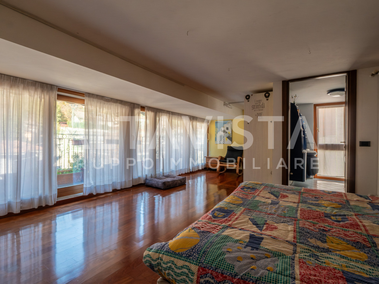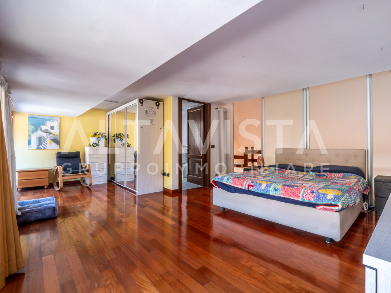 Dal soggiorno, una raffinata scala in legno porta al piano superiore, dove un suggestivo ballatoio affacciato sulla zona giorno crea un effetto scenografico di grande charme. Qui si trova la suite padronale, con terza camera dalle dimensioni generose e secondo bagno finestrato, perfetta per garantire privacy.