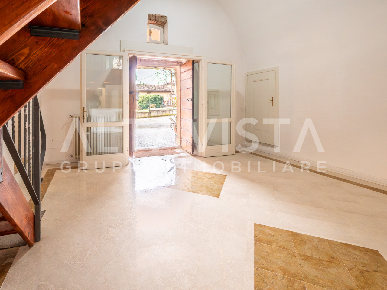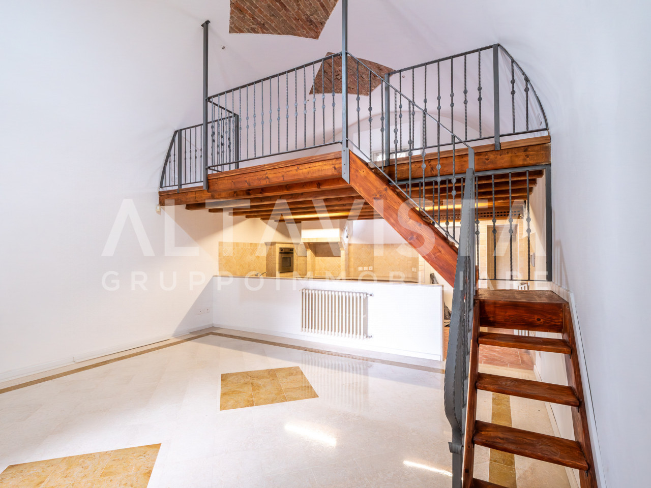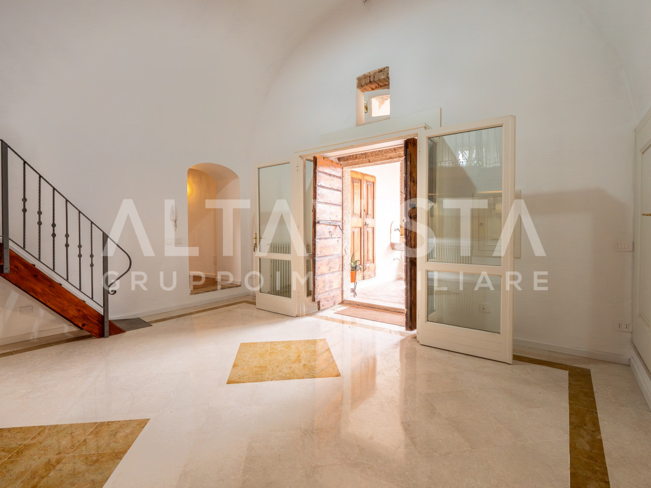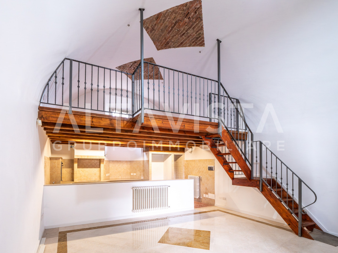 L’ingresso apre su una luminosa zona giorno open-space con cucina in muratura e piano di lavoro su misura. Una scala interna conduce al suggestivo soggiorno soppalcato, caratterizzato da un elegante soffitto a volta. I pavimenti in marmo, cotto e parquet si alternano con armonia, valorizzando ambienti curati nei minimi dettagli e rifiniti con materiali di pregio.