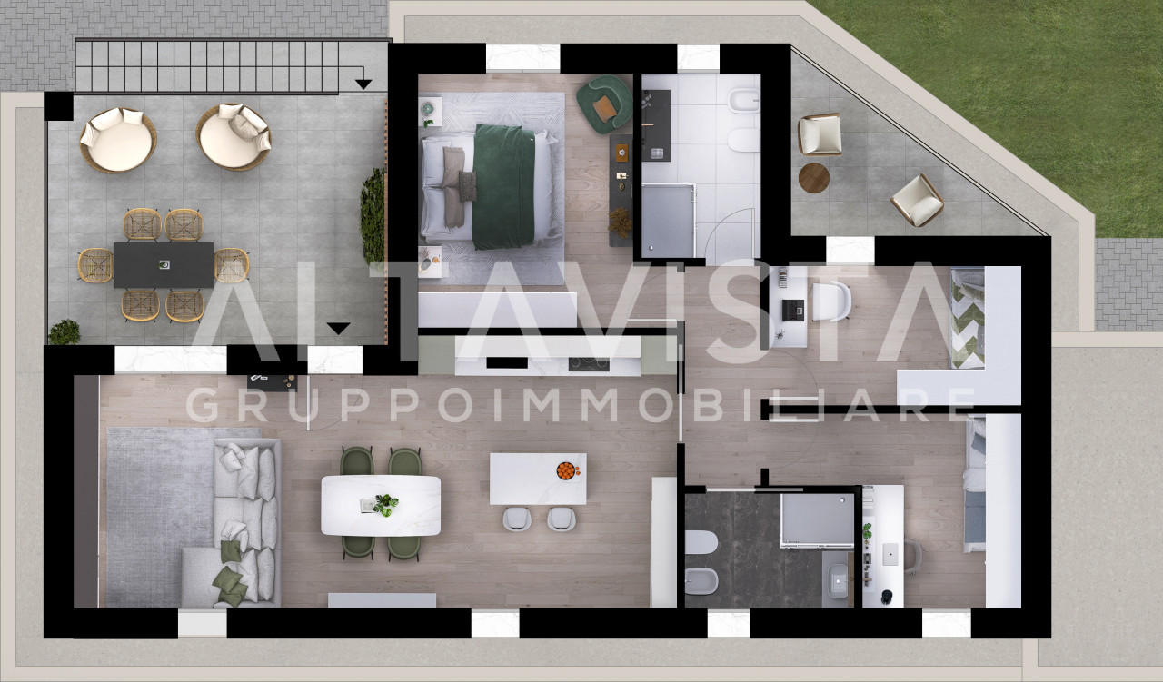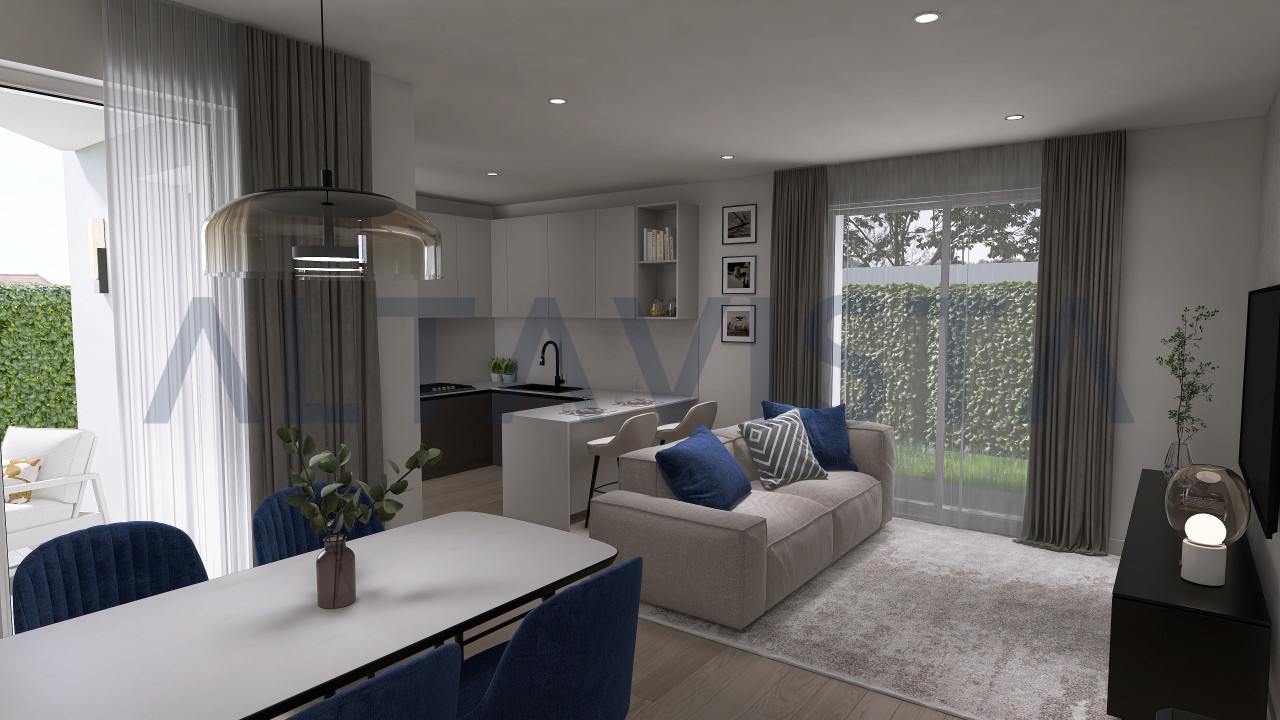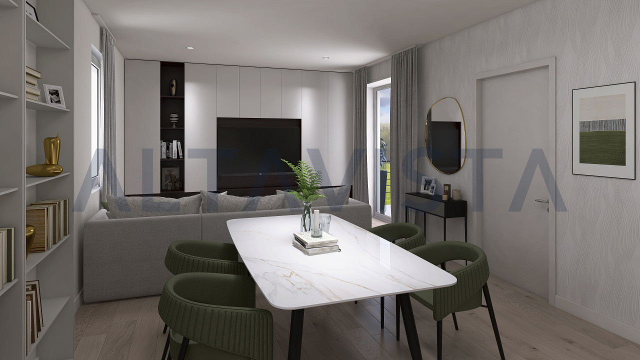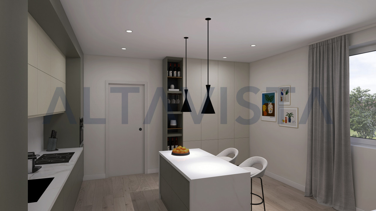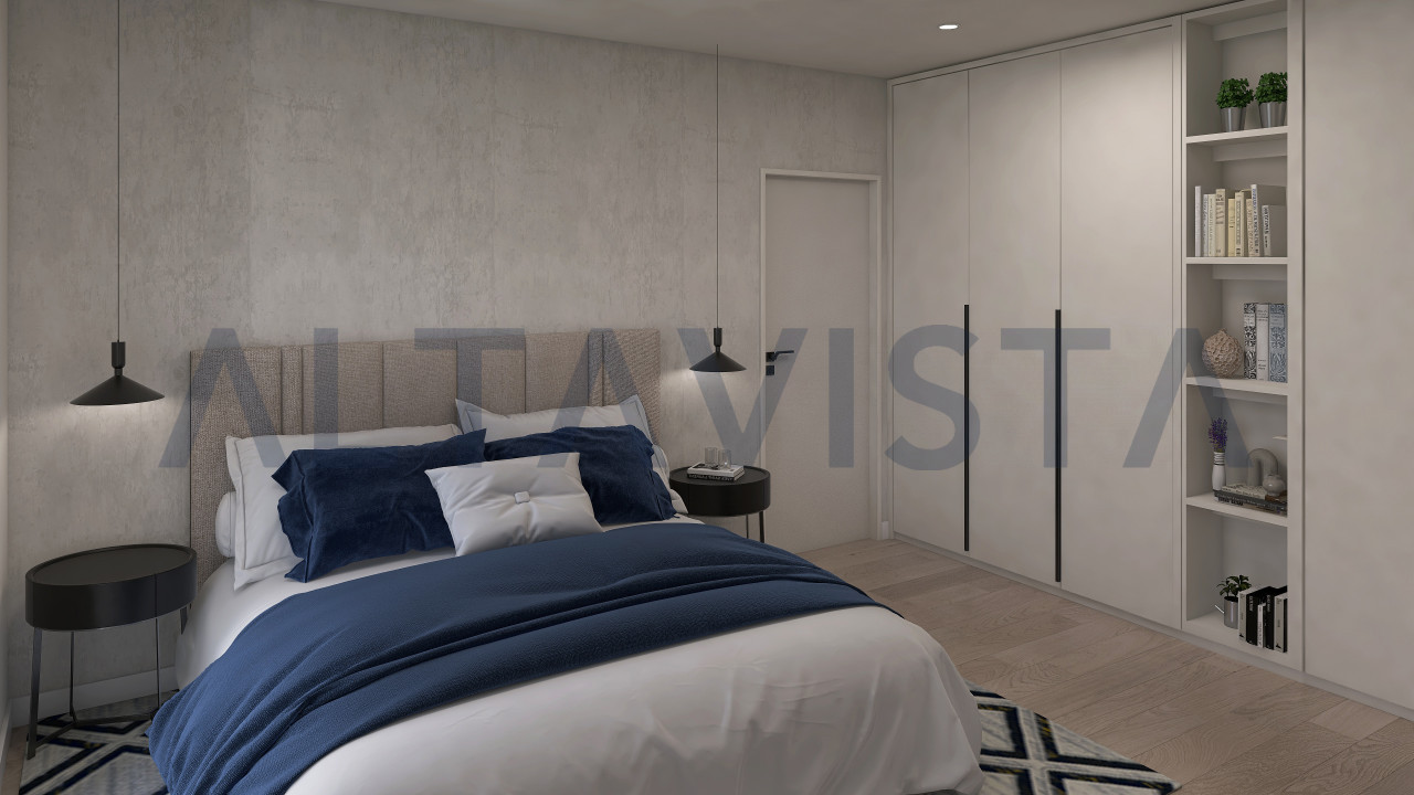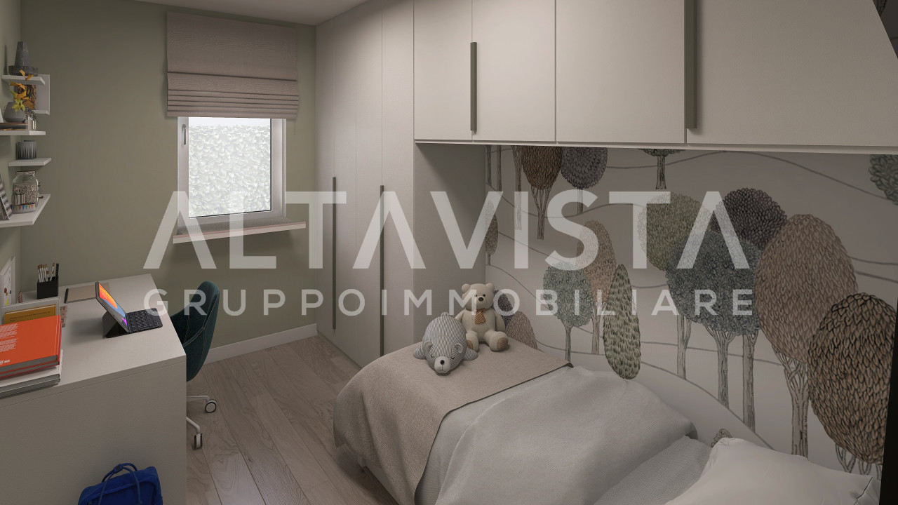 La soluzione si sviluppa con ingresso sulla luminosa zona giorno con cucina a vista, zona notte composta da due camere da letto singole, una spaziosa camera da letto matrimoniale con bagno padronale e secondo bagno con box doccia e sanitari sospesi.