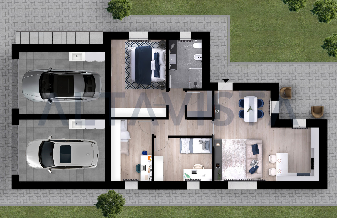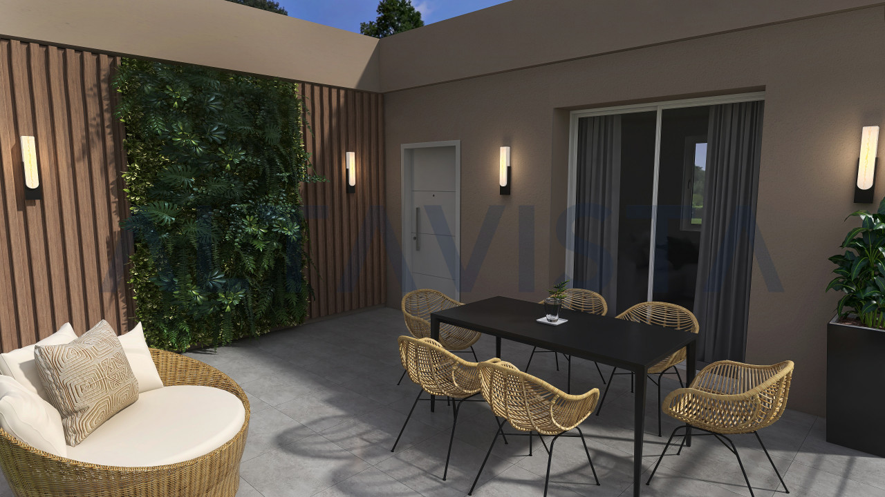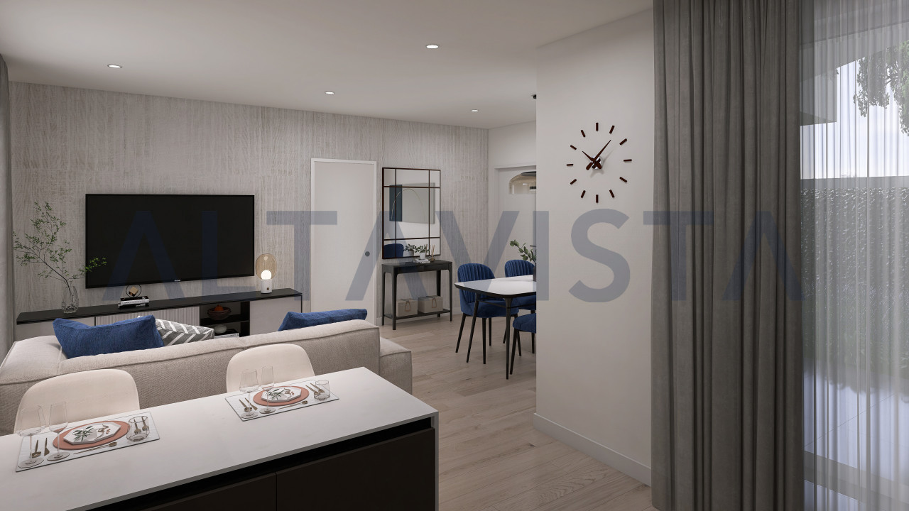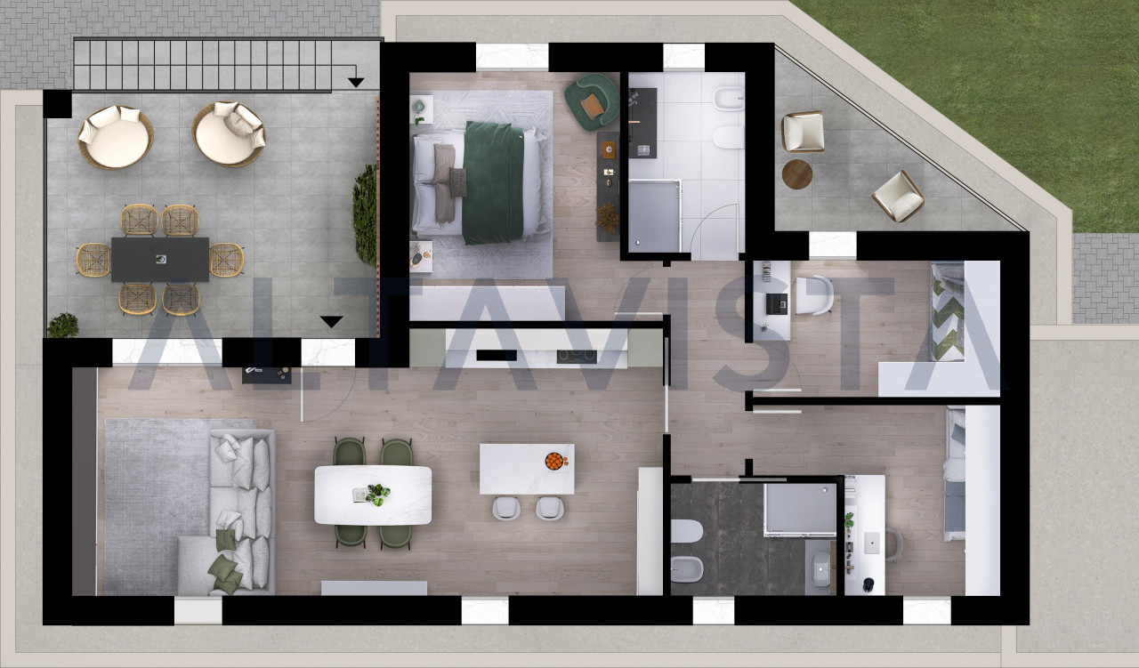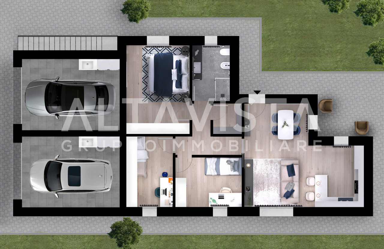 La soluzione si sviluppa con ingresso sulla luminosa zona giorno con cucina a vista, zona notte composta da due camere da letto singole, una spaziosa camera da letto matrimoniale con bagno padronale e secondo bagno con box doccia e sanitari sospesi.
