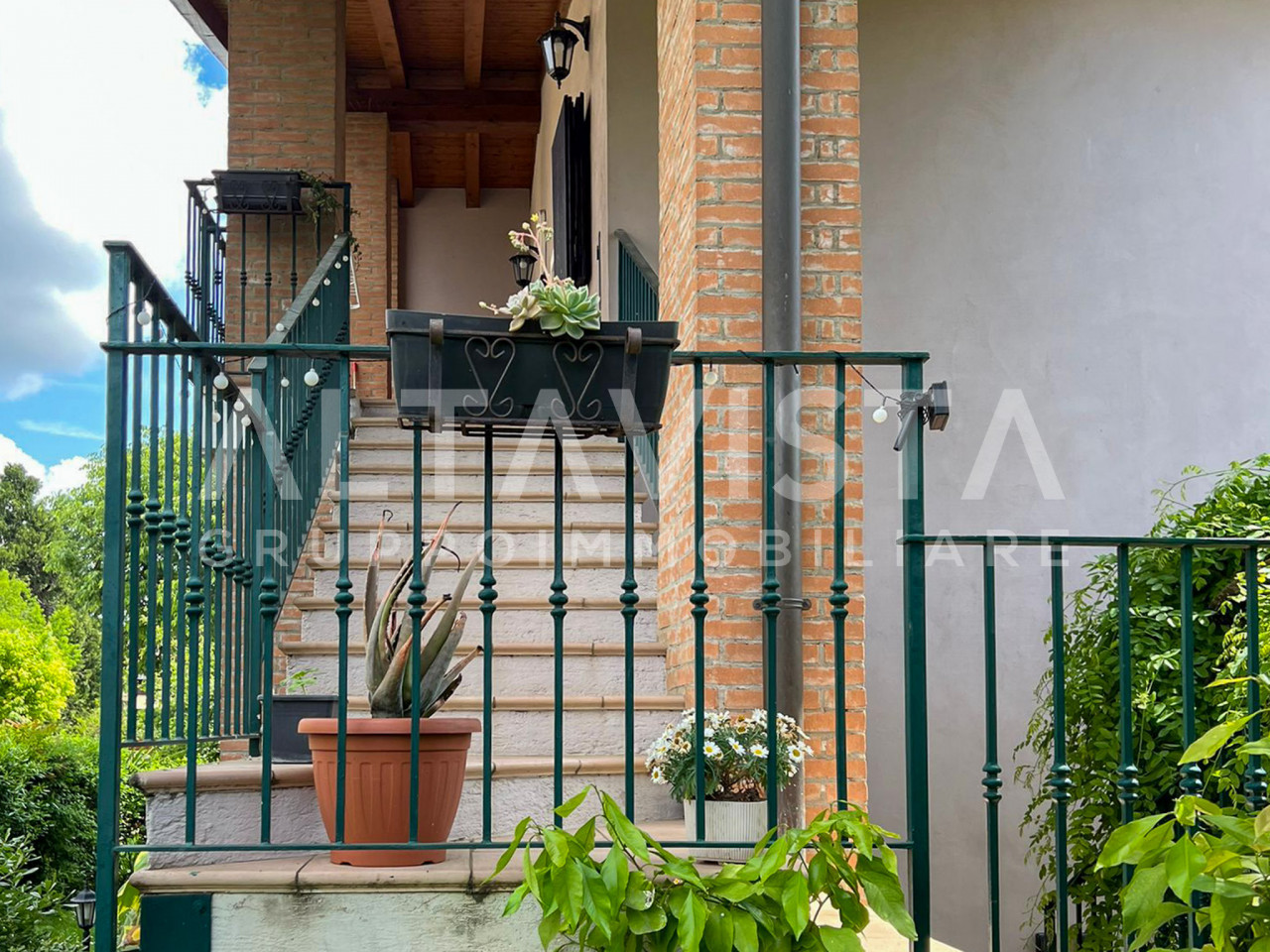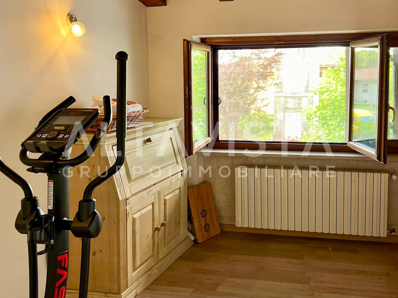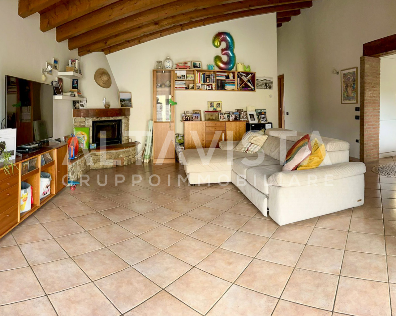 Al piano terra si trovano il giardino esclusivo, finemente piantumato e servito da irrigazione automatica, oltre all’autorimessa singola. Una scala privata conduce al piano primo, dove un terrazzo d’ingresso anticipa l’abitazione. Gli spazi interni sono ben distribuiti: il soggiorno è caratterizzato dal camino e dalle travi a vista, la cucina è separata e abitabile, la zona notte comprende una camera matrimoniale con bagno privato, una seconda camera matrimoniale, una terza stanza utilizzabile come studio o guardaroba e un secondo bagno/lavanderia di servizio.