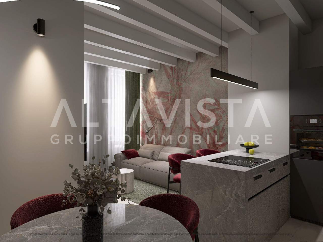 L’ingresso si apre su una luminosa zona giorno con cucina a vista, ideale per momenti di convivialità.