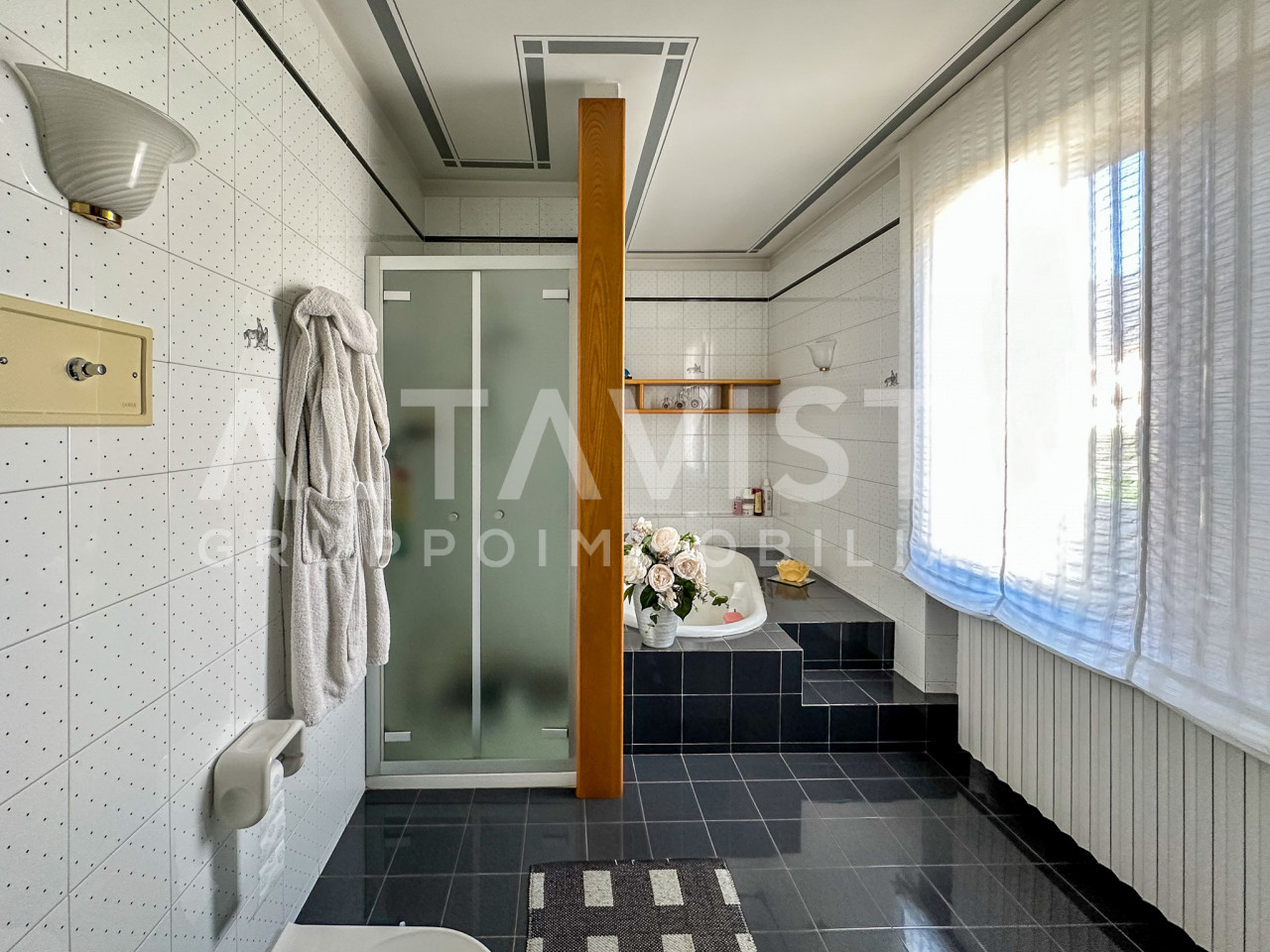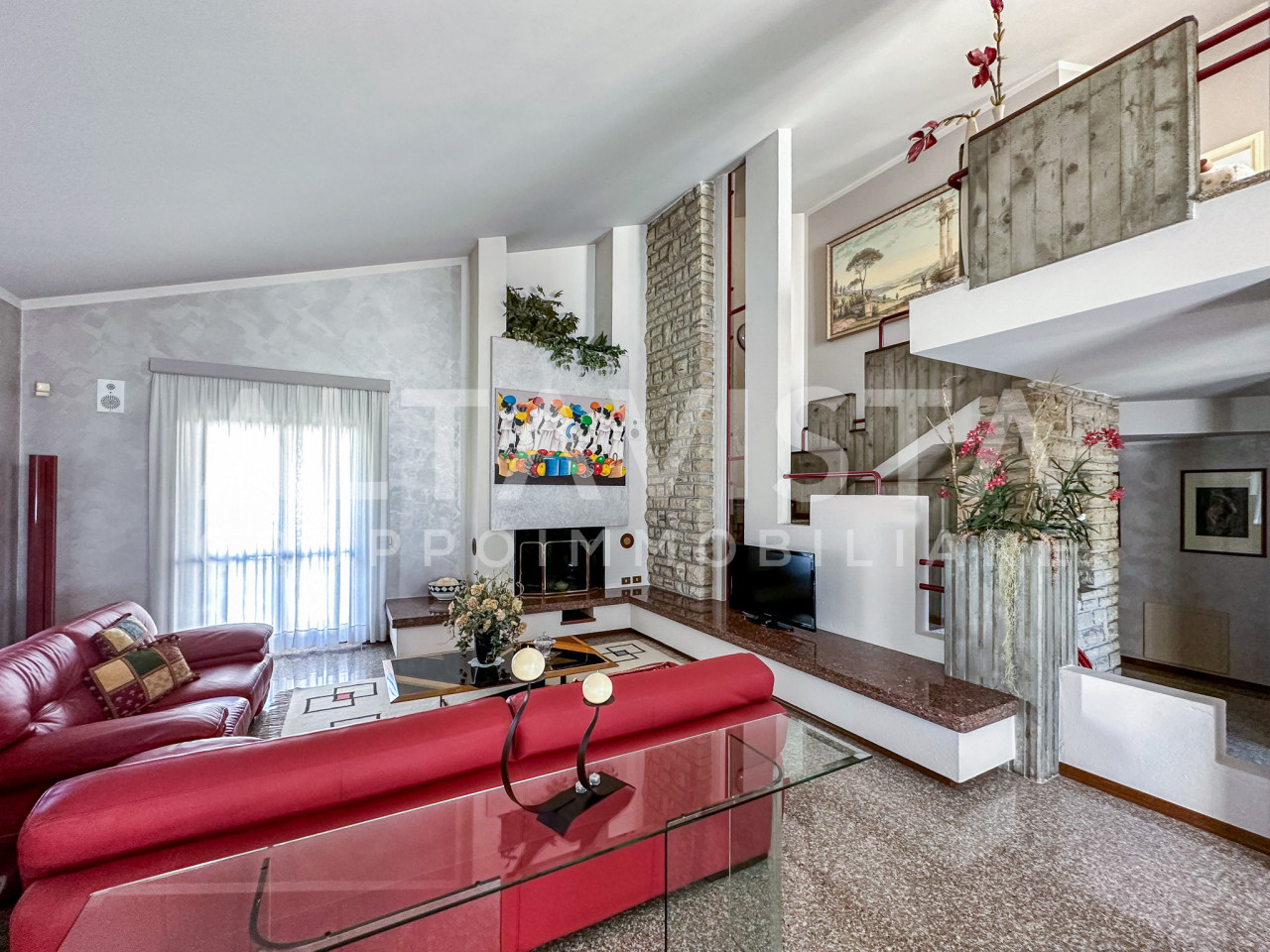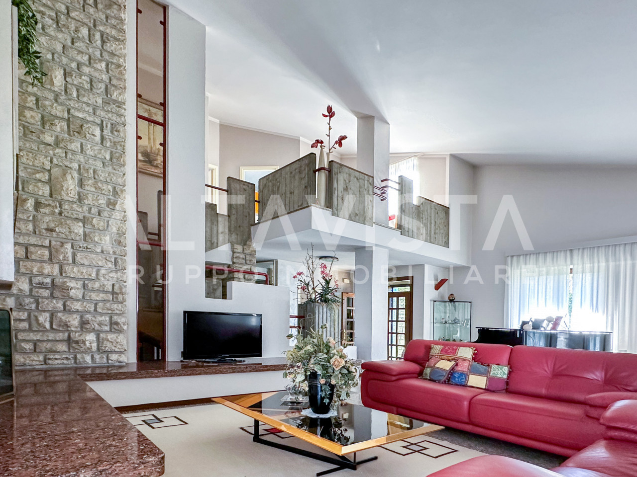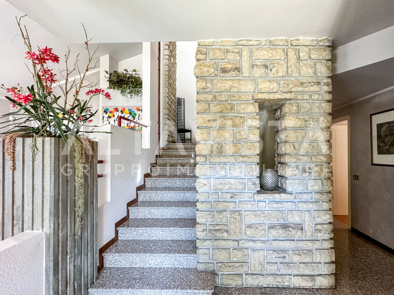 L’ingresso, luminoso e organizzato con una comoda bussola, introduce al living molto spazioso, caratterizzato da un’intera parete dedicata al camino rivestito in Credaro. La scala centrale, per finiture e geometrie, si presenta come un elemento architettonico di grande pregio. La cucina è abitabile, con area cottura ben separata dalla zona pranzo.