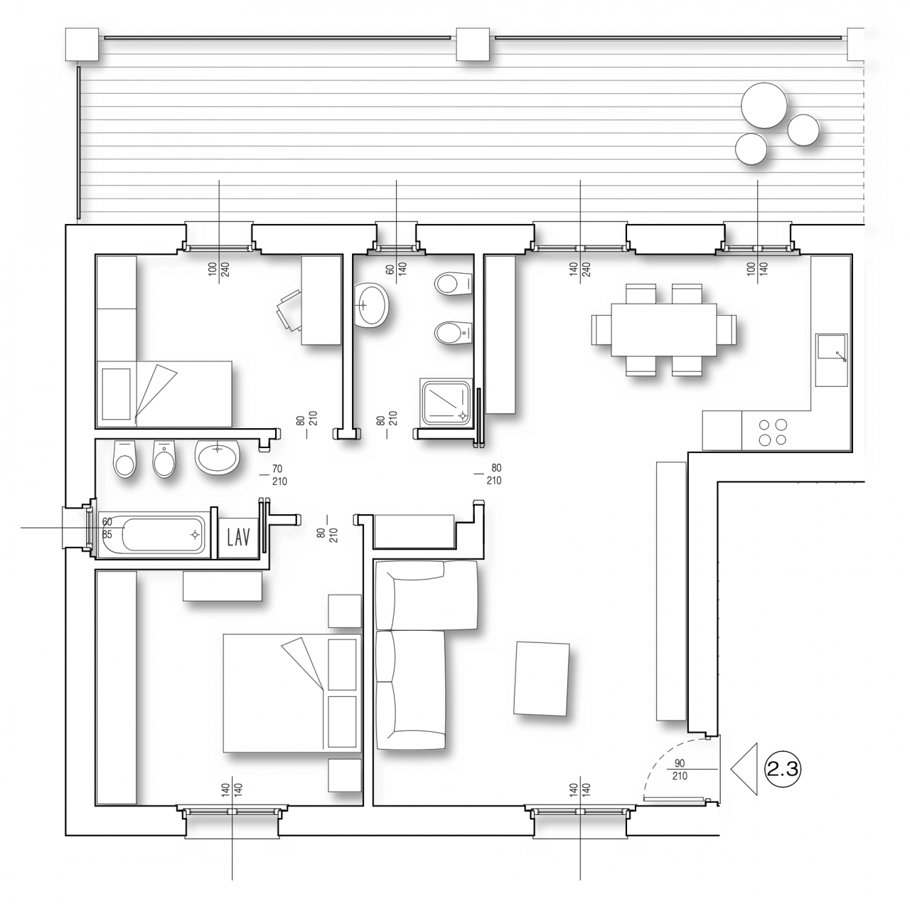 Caratterizzato da un'architettura moderna e funzionale, l'appartamento vanta un'ampia loggia con travi a vista, perfetta per godersi momenti di relax e divertimento. All'interno, una spaziosa zona giorno accoglie una cucina pranzo e un luminoso soggiorno, entrambi con accesso diretto alla loggia esclusiva di circa 30 mq. Nel soggiorno ben si individua la zona per un comodo divano e una grande parete attrezzata, oltre alla zona del pranzo, mentre l'ampia cucina a vista è una bella sorpresa, dopo il soggiorno e la zona del pranzo.