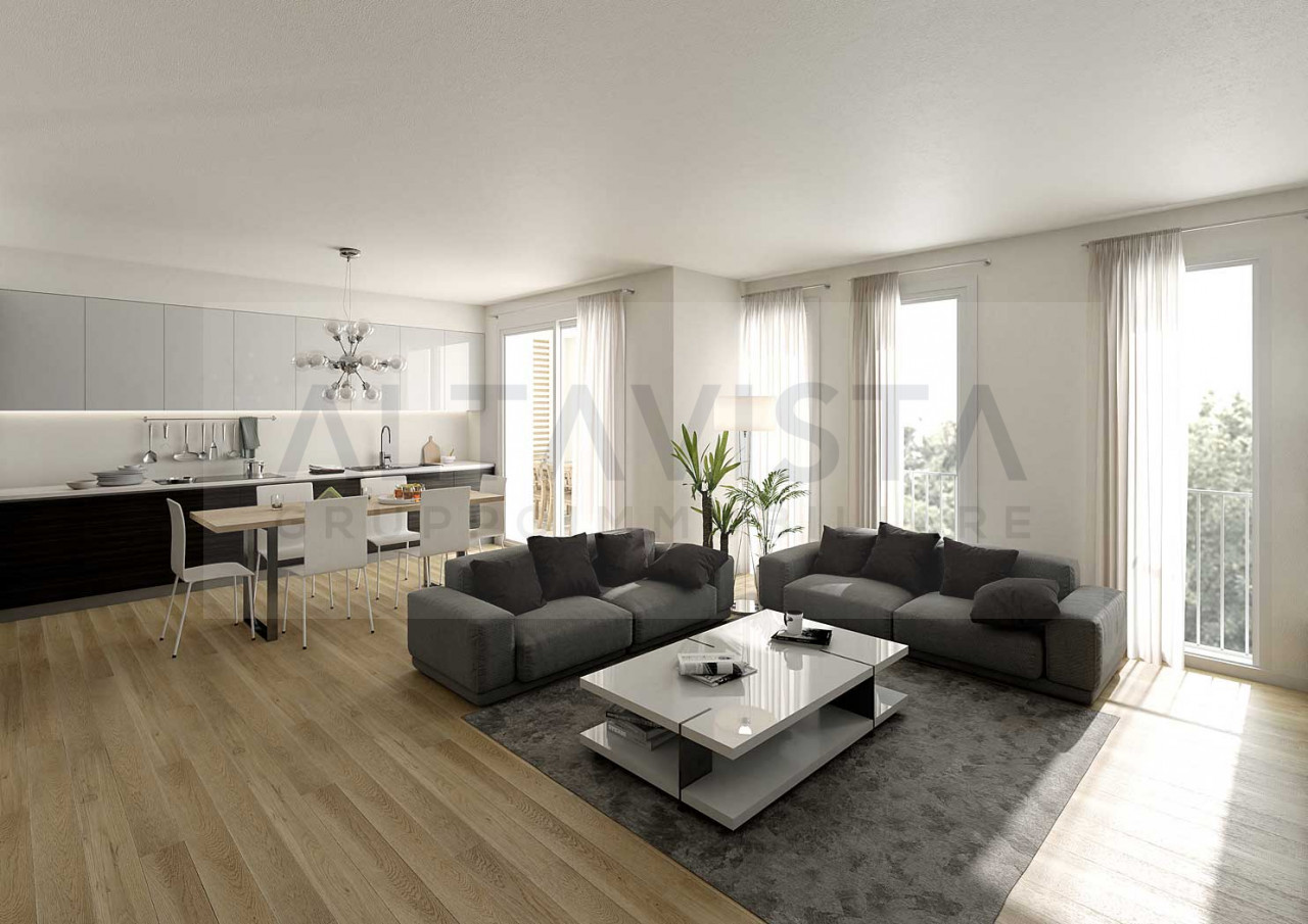 Questo appartamento è sito al piano terra ed è libero su tre lati, l'ingresso porta ad una grande zona giorno che si apre su un portico privato di circa mq 25 mq e un giardino di oltre 200 mq, che permette di avere anche un secondo ingresso indipendente.