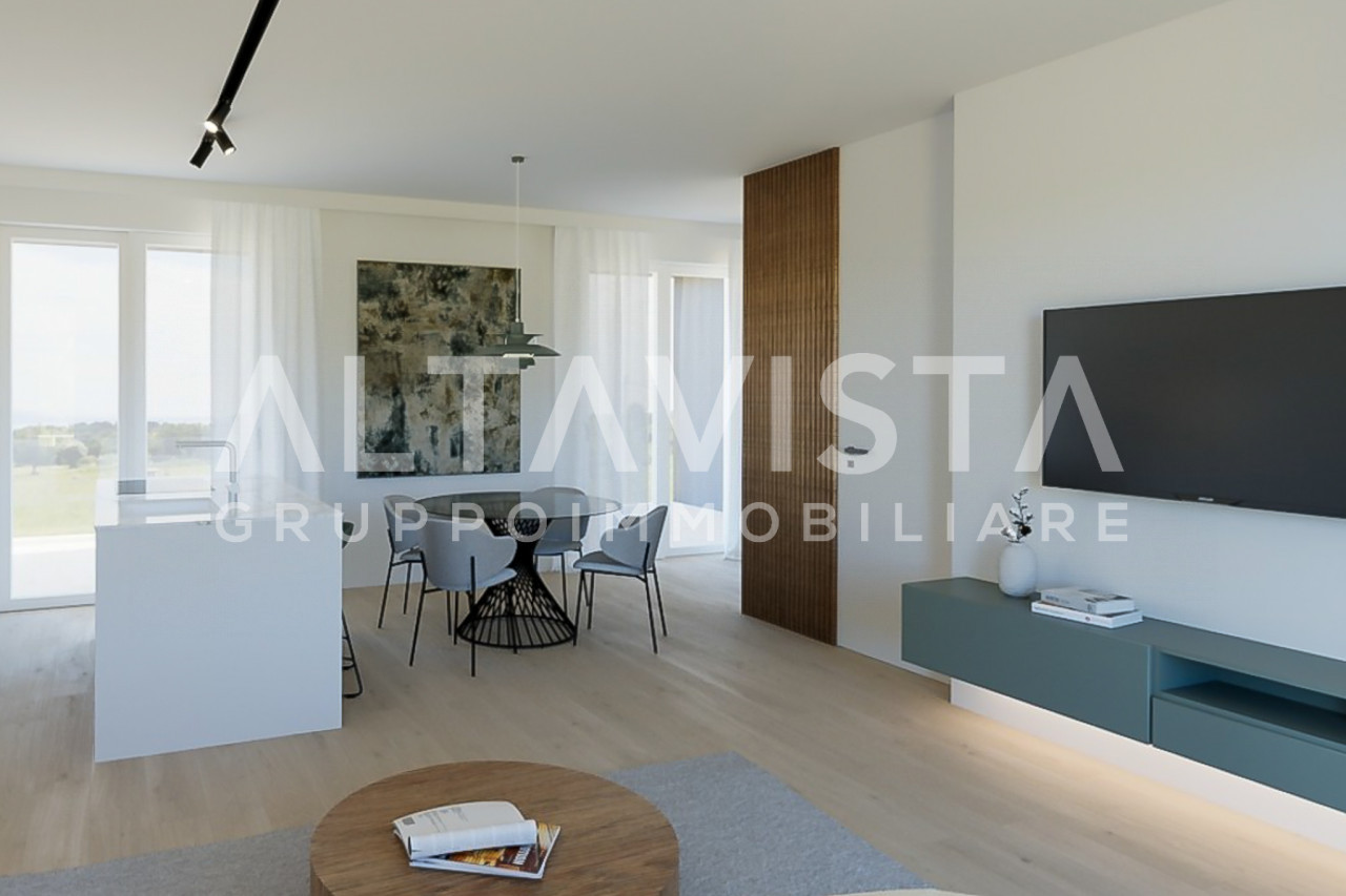 Al primo piano si apre una luminosa zona giorno con cucina a vista, che si affaccia su un ampio terrazzo panoramico abitabile, ideale per godere della vista mozzafiato.