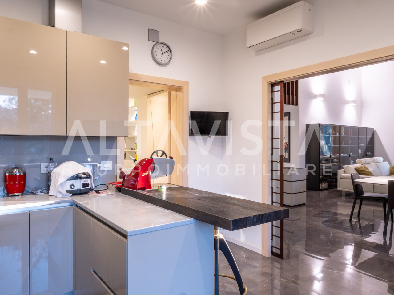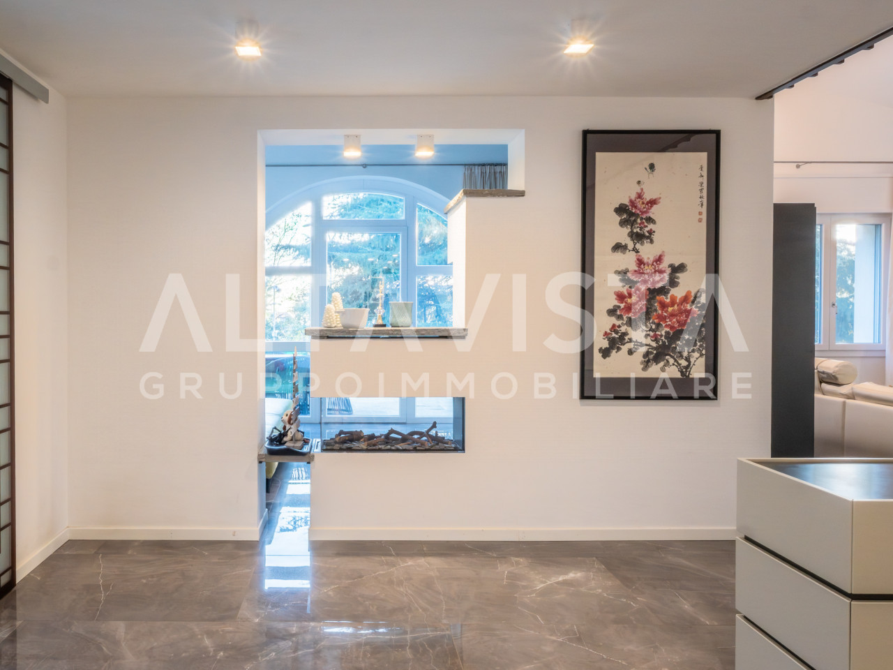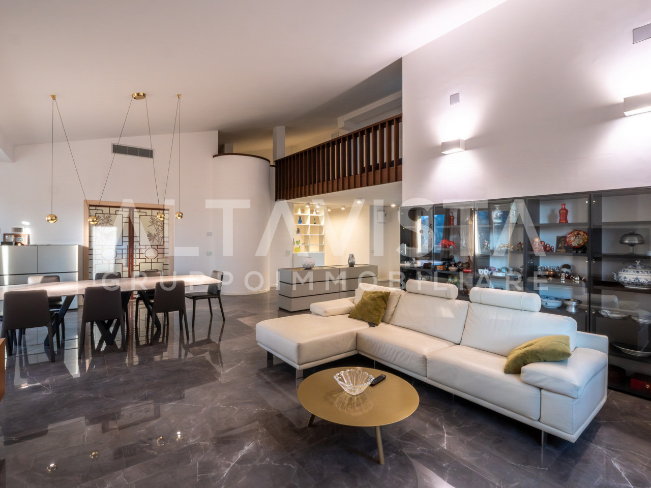 Un elegante ingresso ad arco introduce all’ampio soggiorno, articolato in due ambienti distinti: una zona di accoglienza e un raffinato living con adiacente area pranzo, in diretto collegamento con la cucina separata, dotata di balcone panoramico.