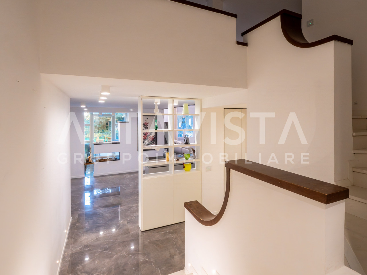 Al piano superiore troviamo un accogliente soggiorno con uscita sul giardino, cucina abitabile separata, due camere matrimoniali e due bagni, distinti tra reparto giorno e notte.