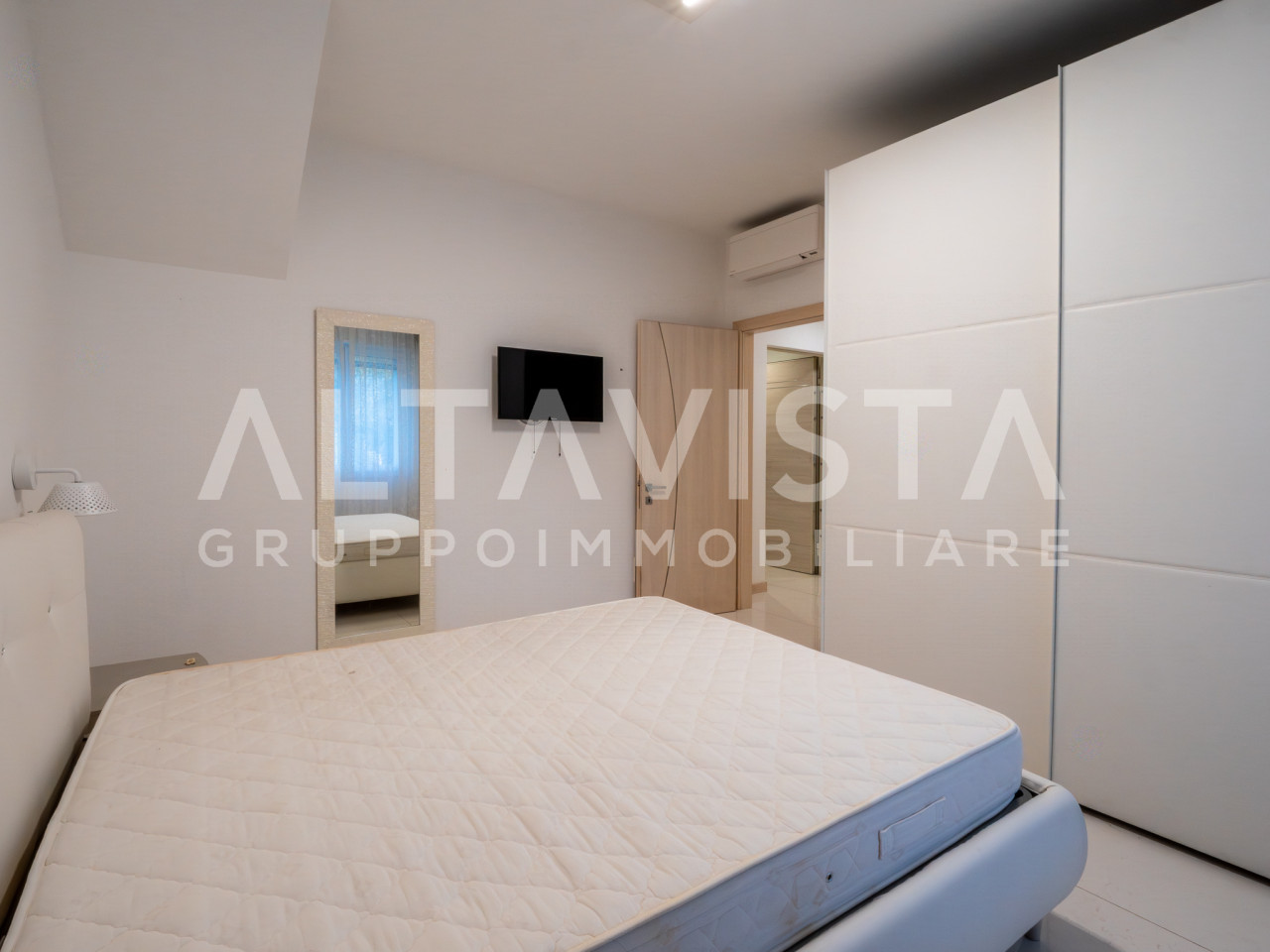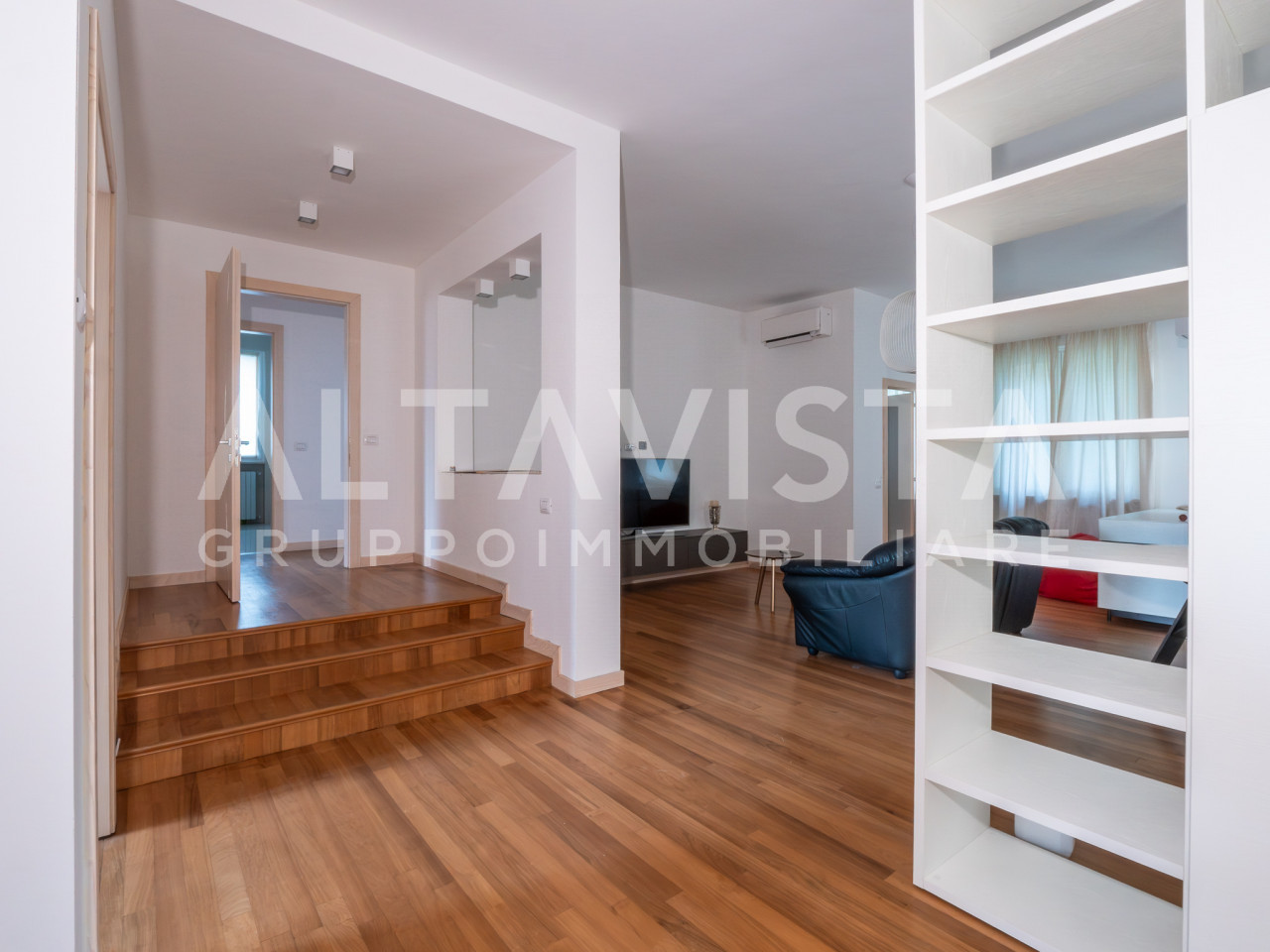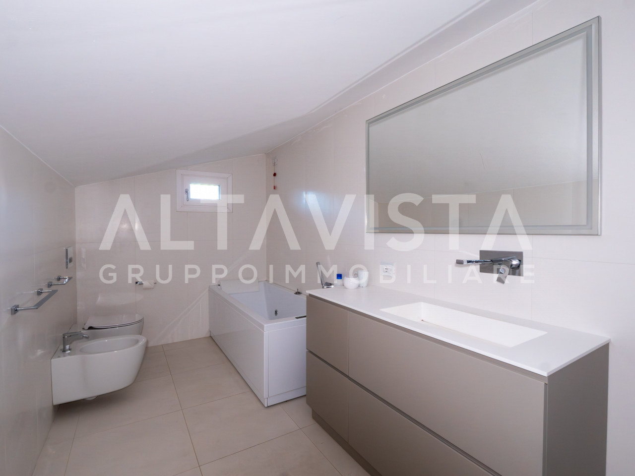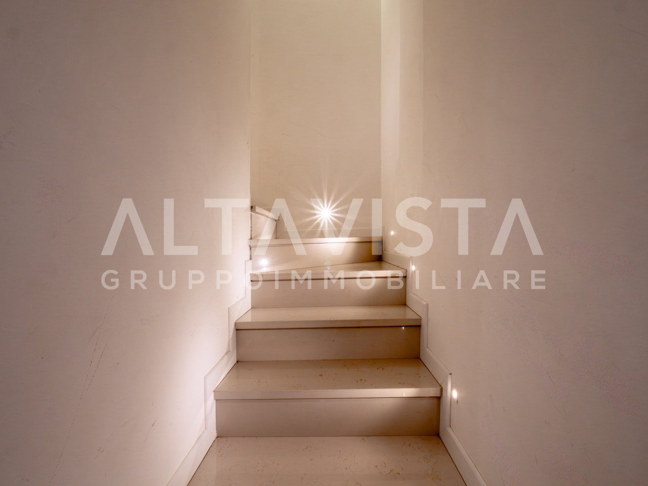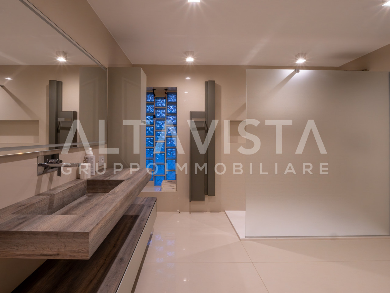 Una leggera scalinata conduce al reparto notte, dove trovano spazio tre camere matrimoniali e due bagni finestrati, rifiniti con materiali ricercati.