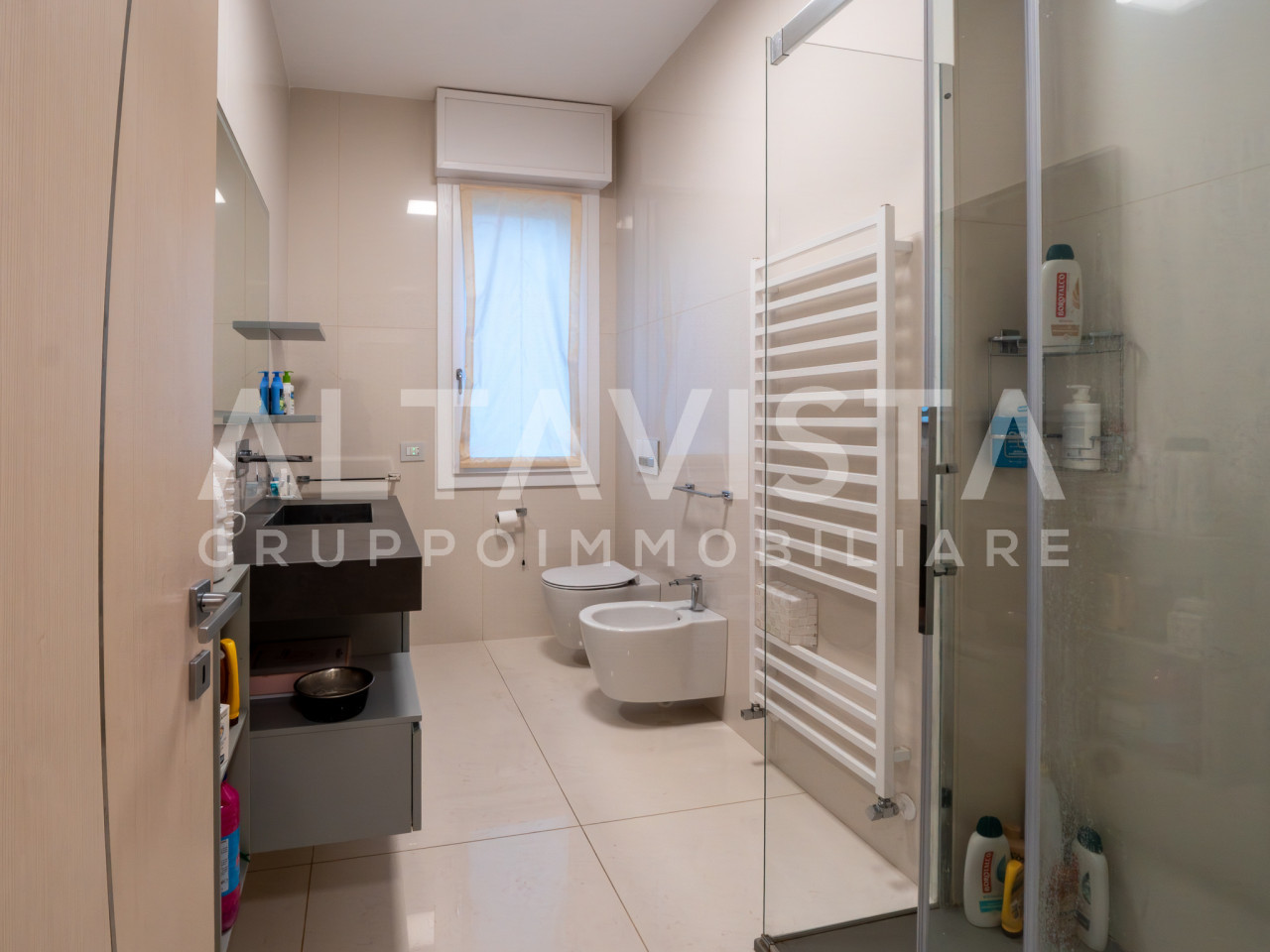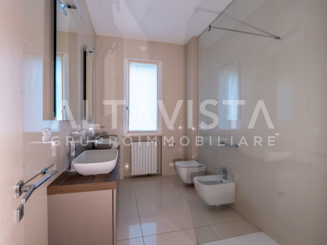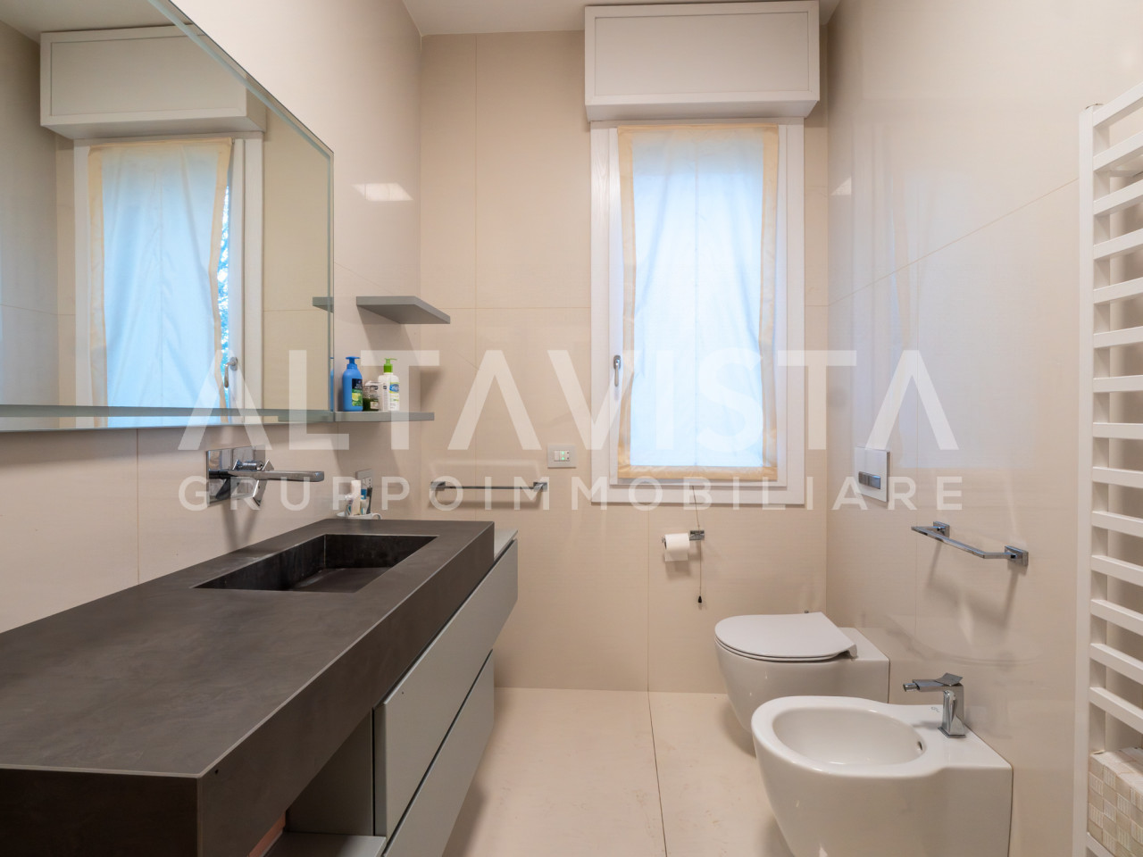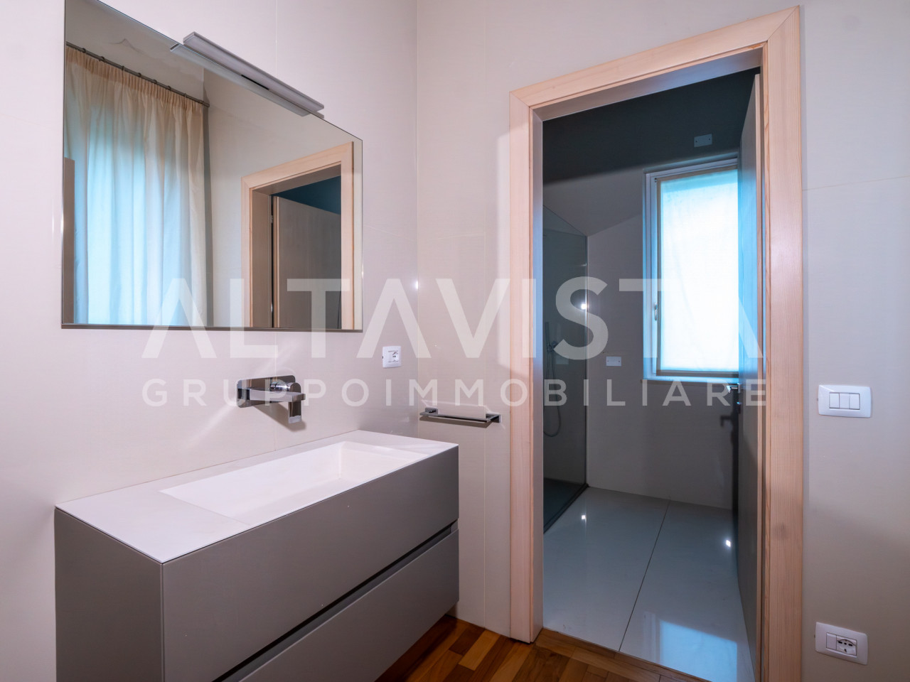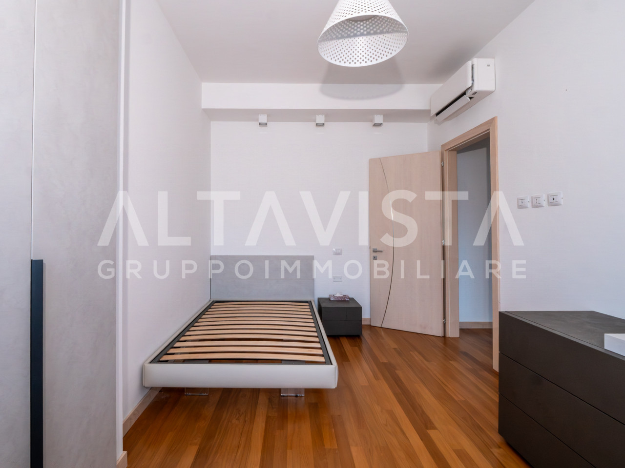 Una leggera scalinata conduce al reparto notte, dove trovano spazio tre camere matrimoniali e due bagni finestrati, rifiniti con materiali ricercati.