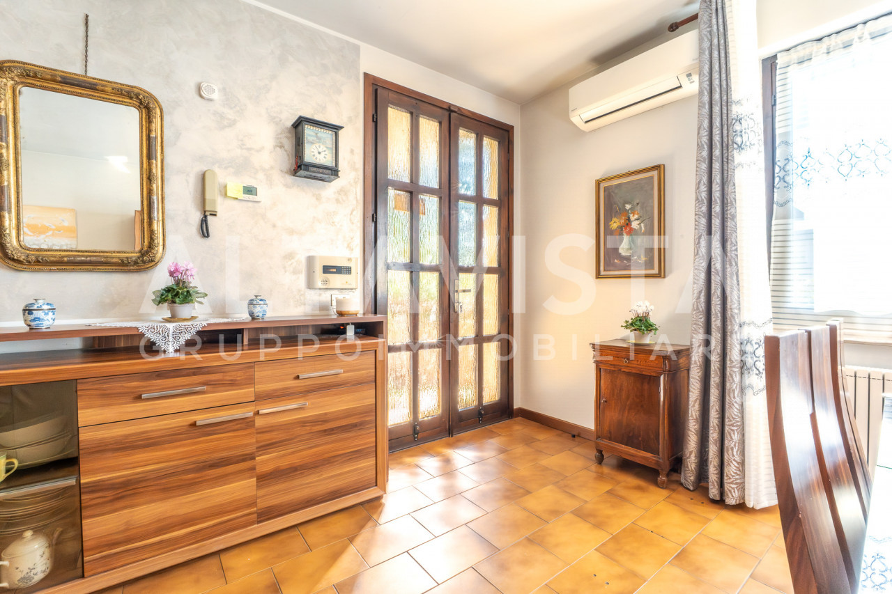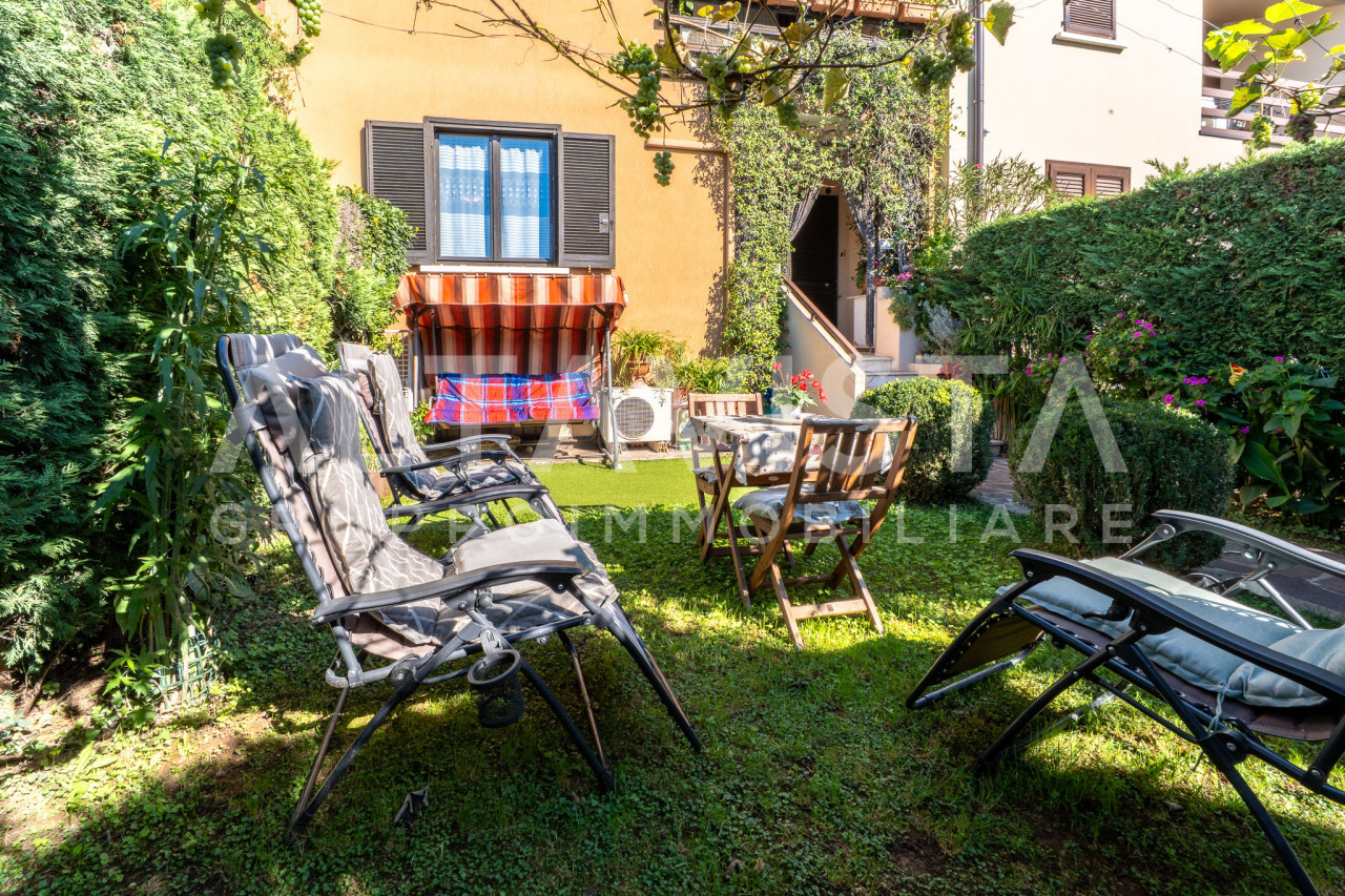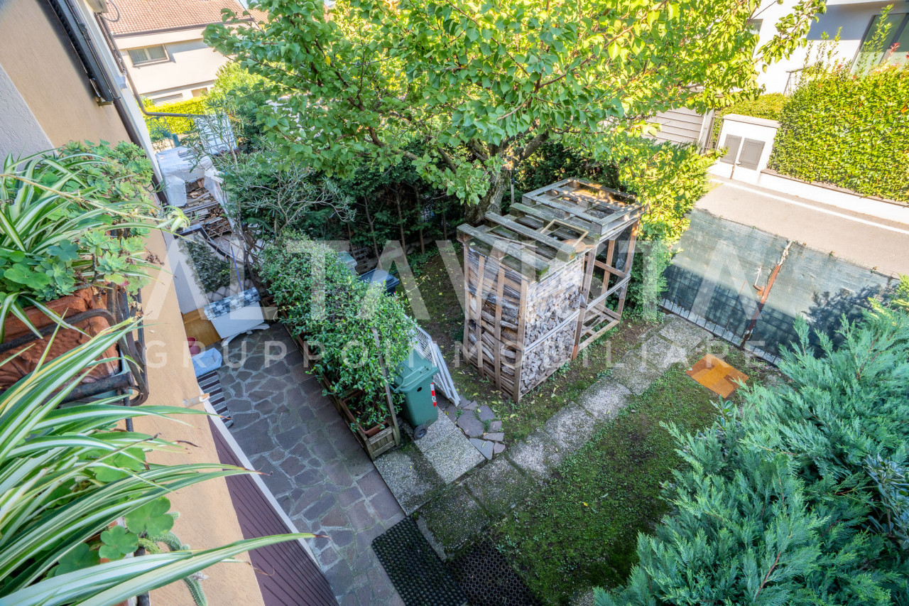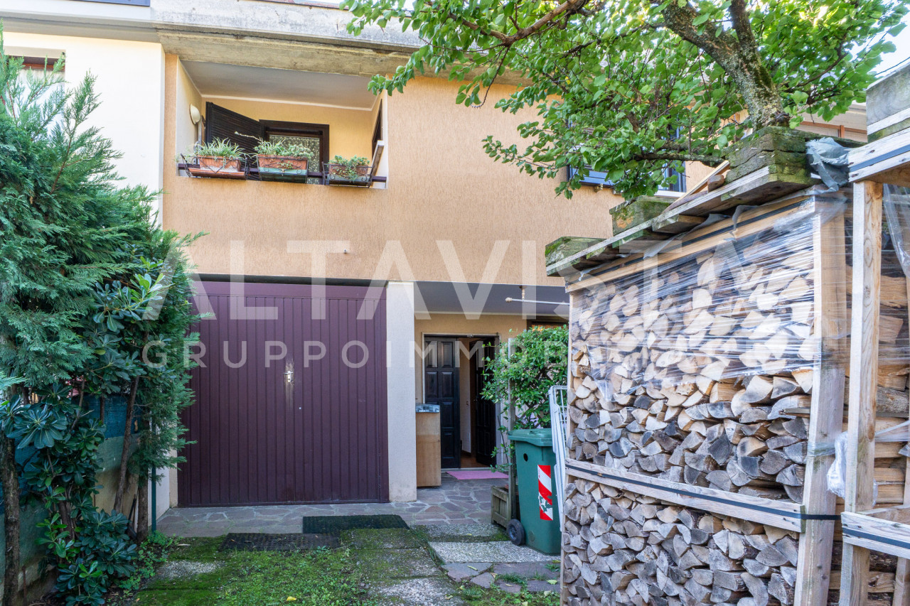 Dal soggiorno qualche gradino porta al giardino sul retro, dotato di un comodo porticato per pranzi e cene all’aperto, troviamo poi il garage singolo fuori terra, con passo carraio privato. Dalla zona giorno una scala interna porta al piano seminterrato dove ci accoglie un’ampia taverna con camino, oltre ad una cantina e la lavanderia.