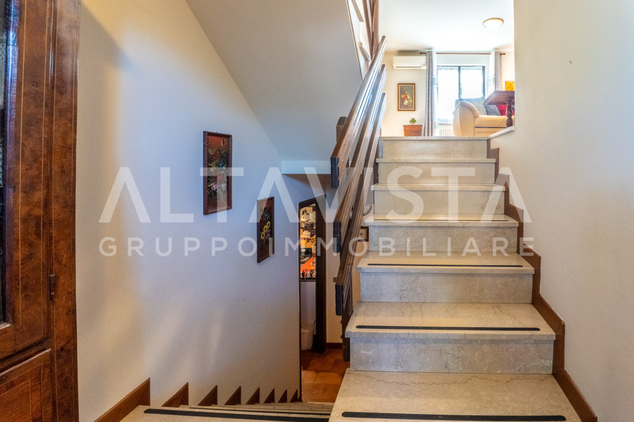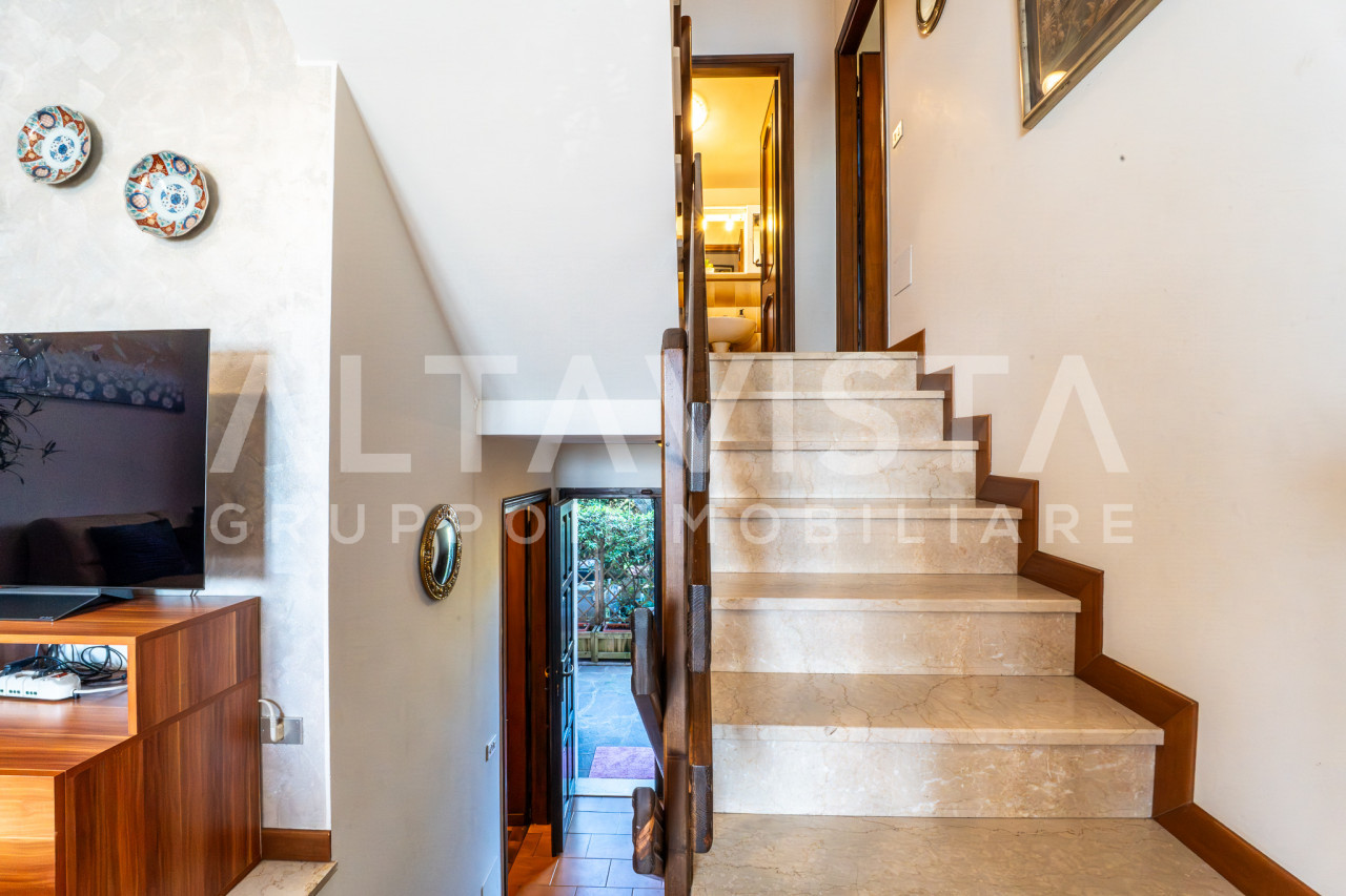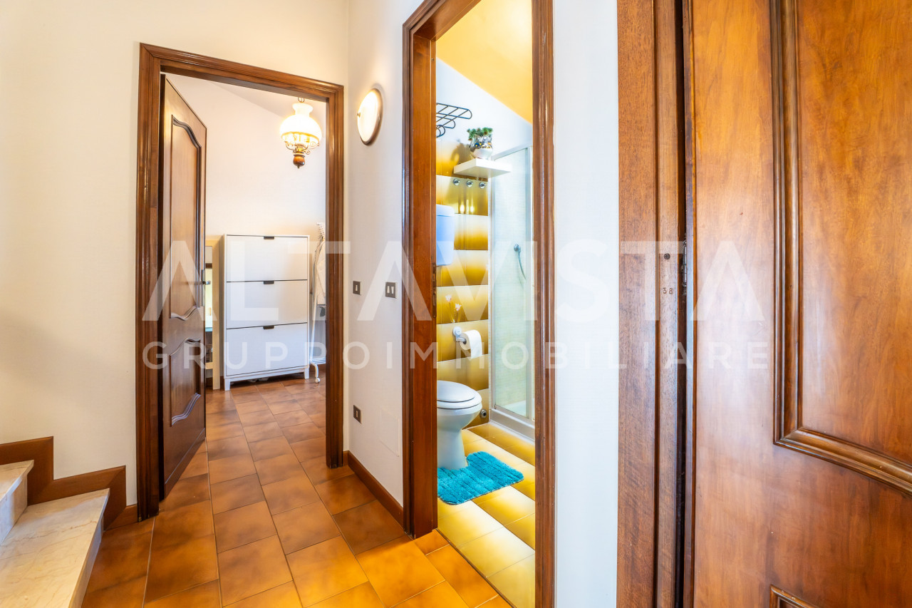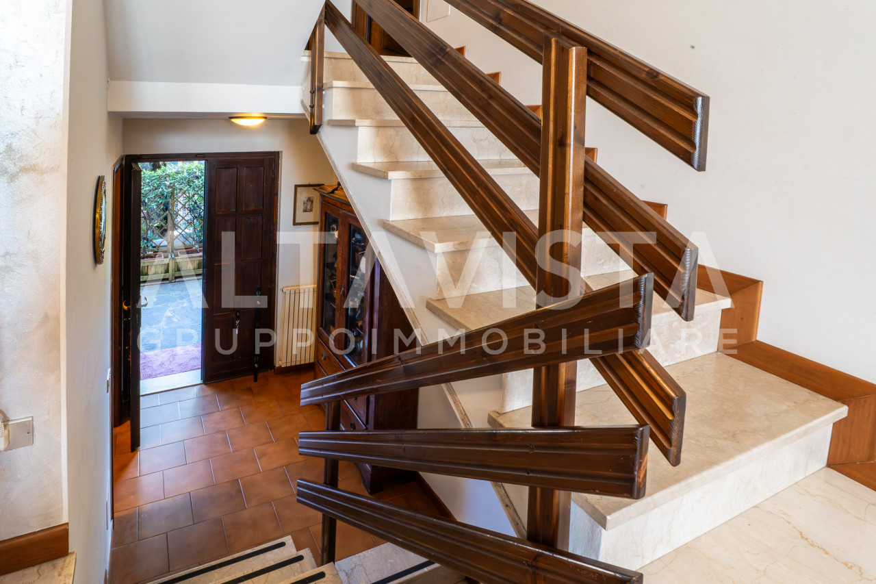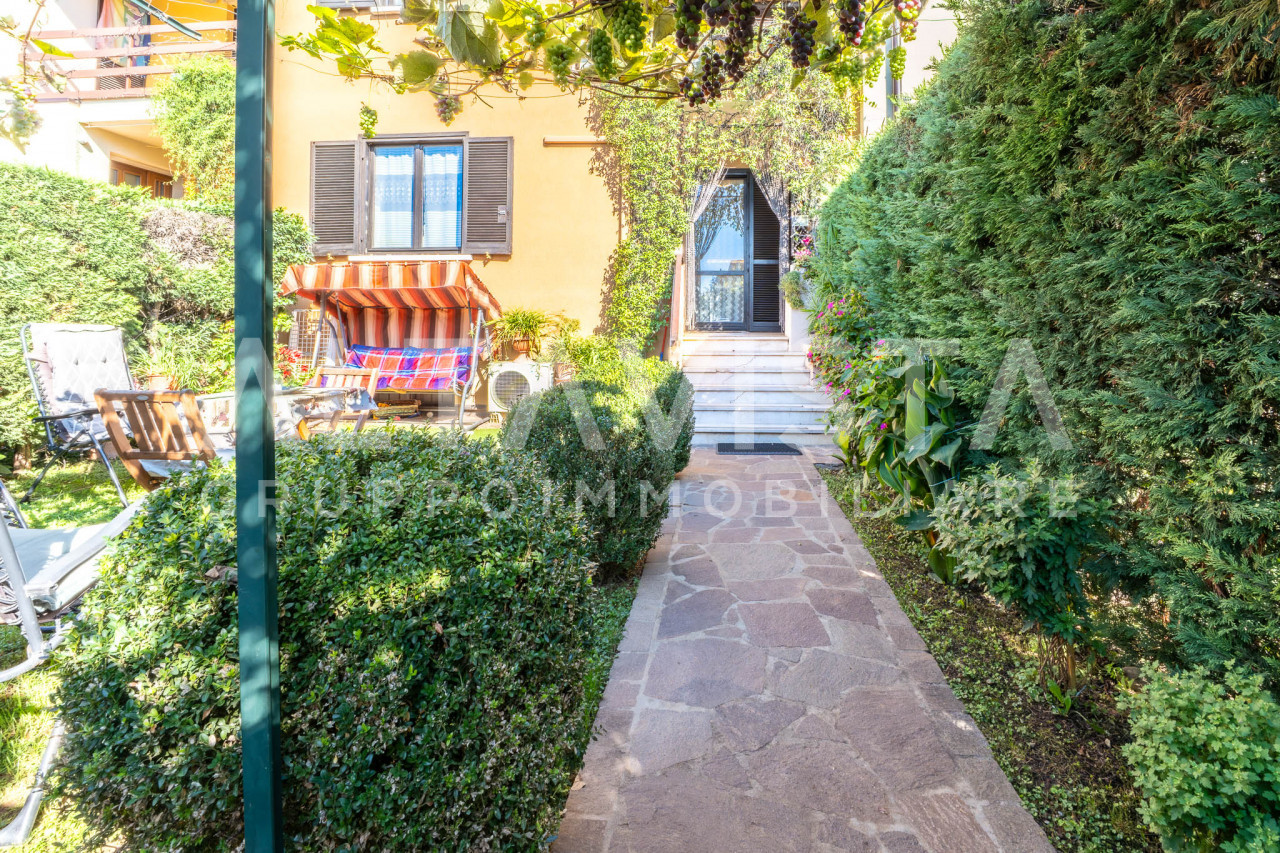 Dal soggiorno qualche gradino porta al giardino sul retro, dotato di un comodo porticato per pranzi e cene all’aperto, troviamo poi il garage singolo fuori terra, con passo carraio privato. Dalla zona giorno una scala interna porta al piano seminterrato dove ci accoglie un’ampia taverna con camino, oltre ad una cantina e la lavanderia.