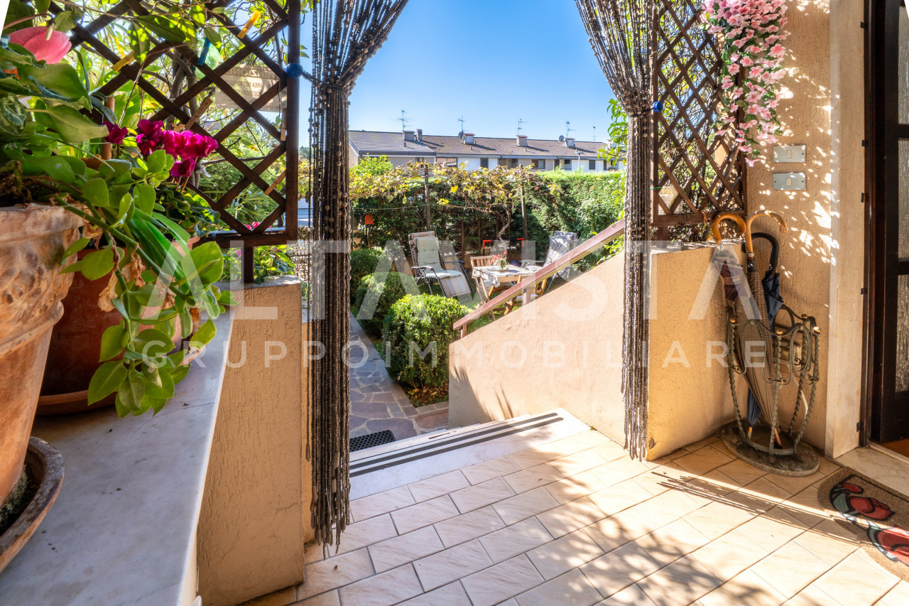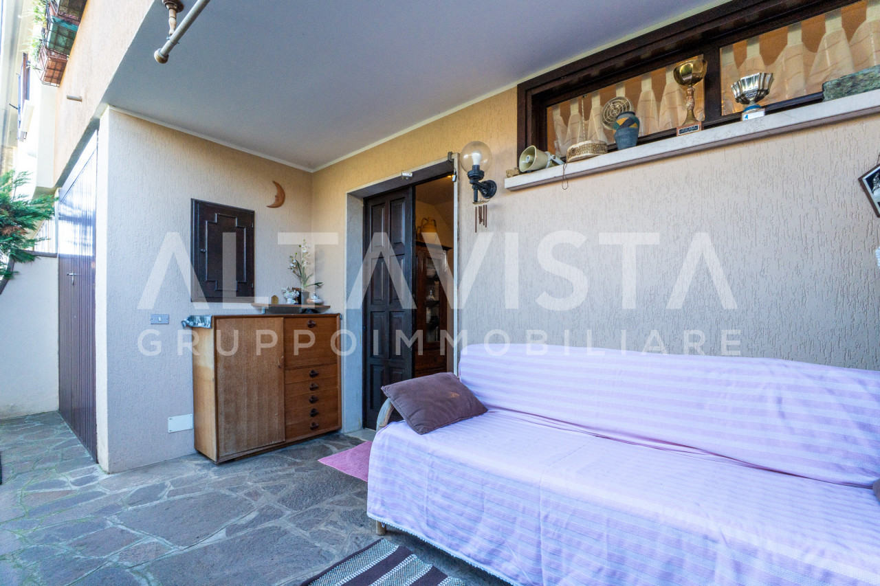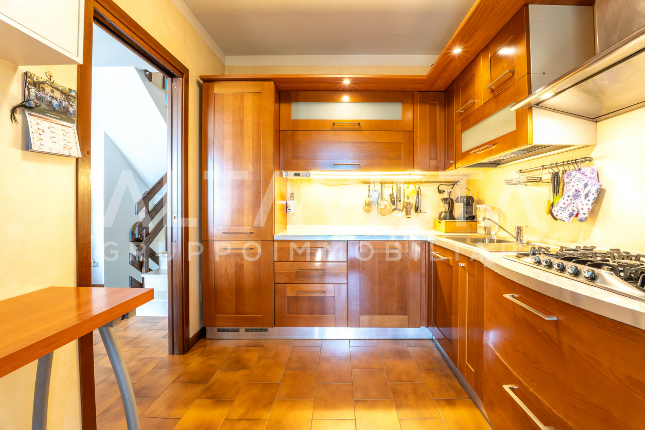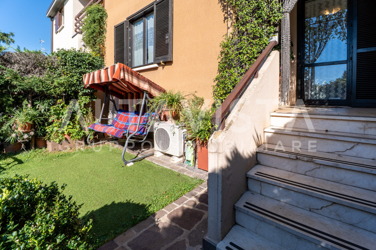 Dal soggiorno qualche gradino porta al giardino sul retro, dotato di un comodo porticato per pranzi e cene all’aperto, troviamo poi il garage singolo fuori terra, con passo carraio privato. Dalla zona giorno una scala interna porta al piano seminterrato dove ci accoglie un’ampia taverna con camino, oltre ad una cantina e la lavanderia.