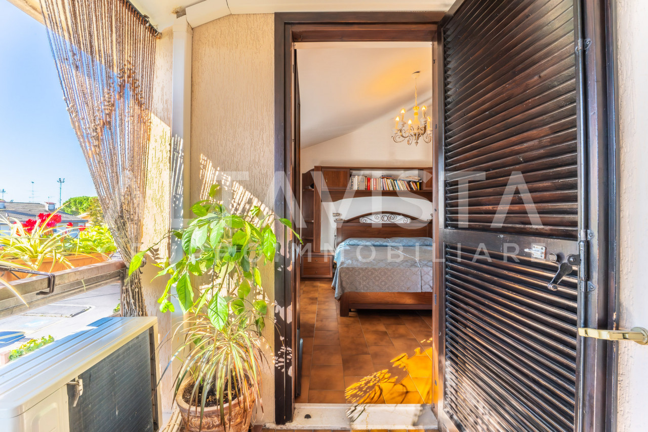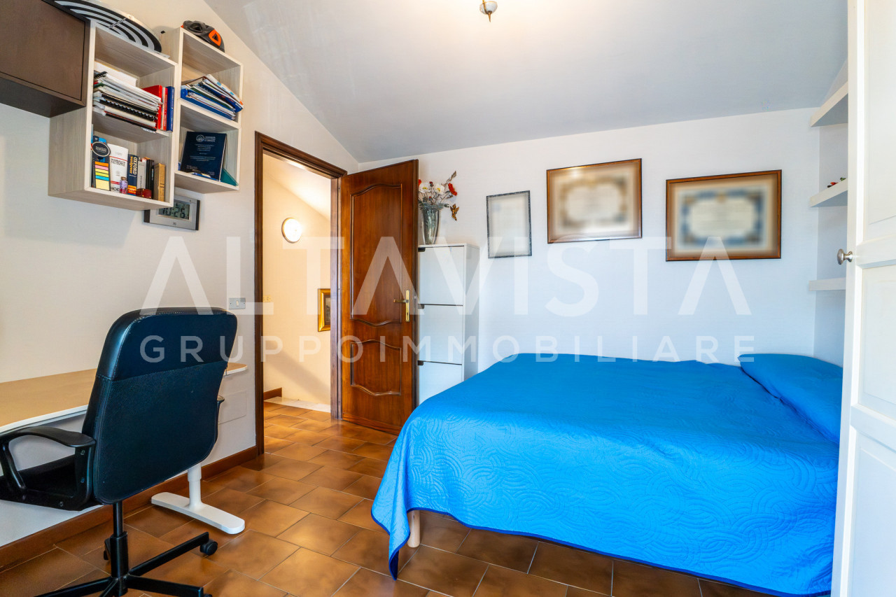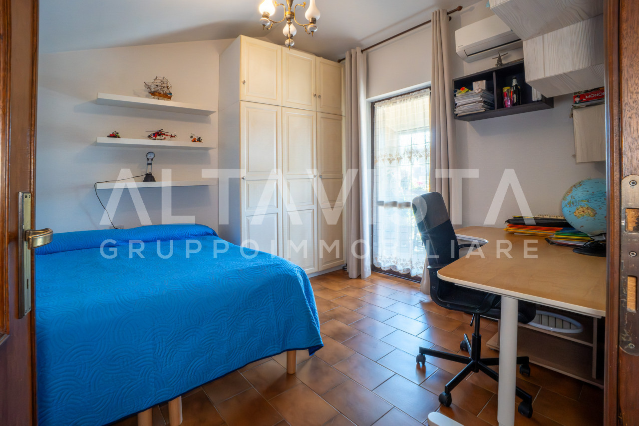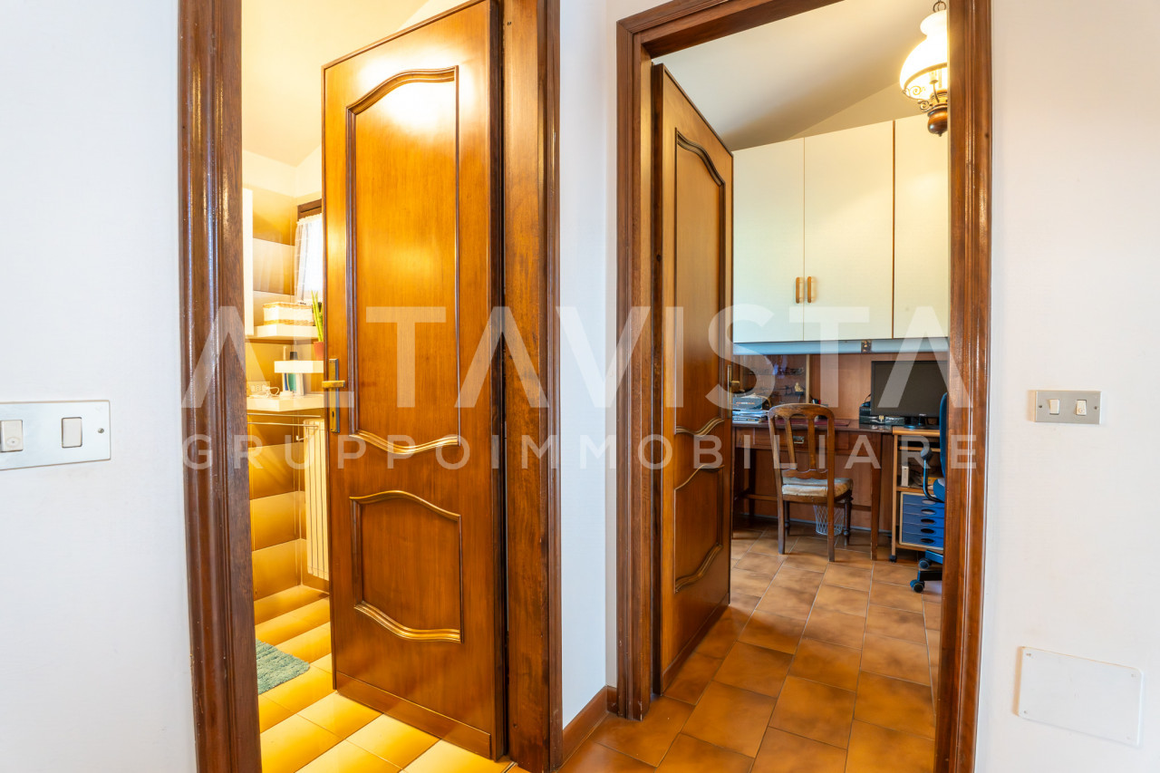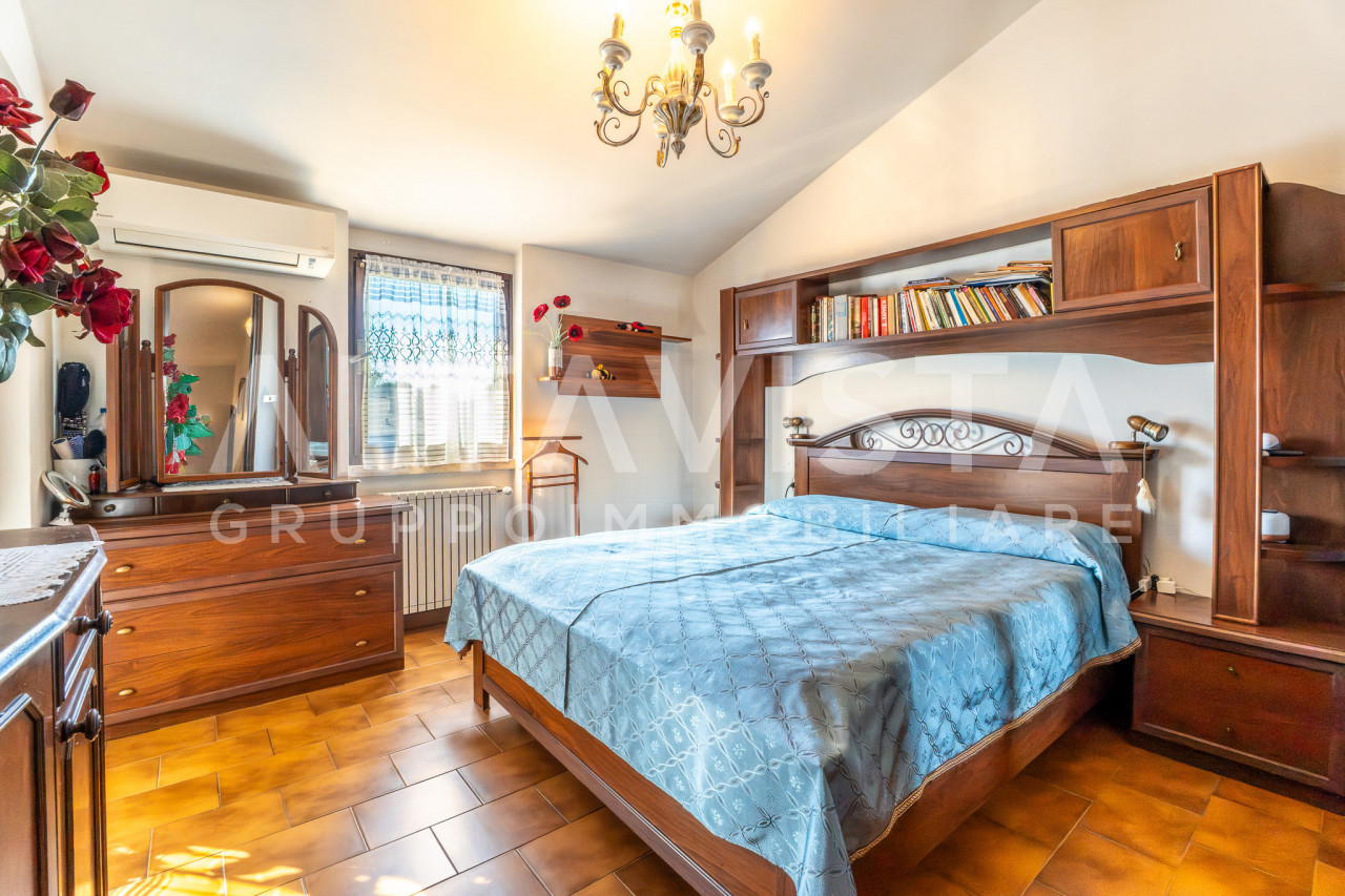 Al livello superiore, la zona notte padronale ospita due ampie camere matrimoniali, entrambe con accesso a un terrazzo che regala una piacevole vista aperta, e un secondo bagno con vasca.